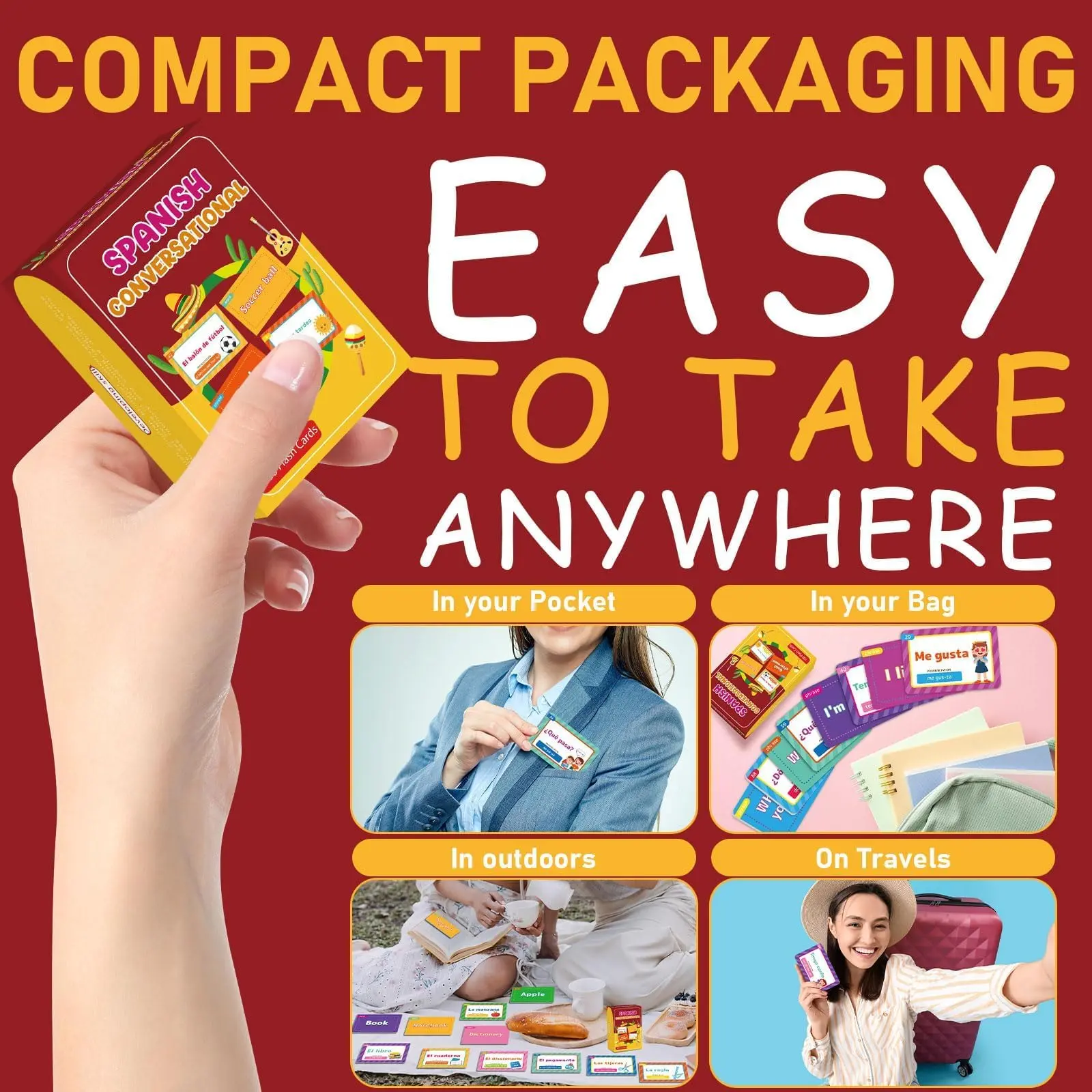 ·Portable and convenient: These Spanish conversational phrase flashcards for bilingual learning are compact and lightweight, making them highly portable and convenient for on-the-go learning. Whether you're studying at home, in a coffee shop, or traveling, you can easily carry the flash cards for adult beginners with you and practice Spanish whenever and wherever you want.