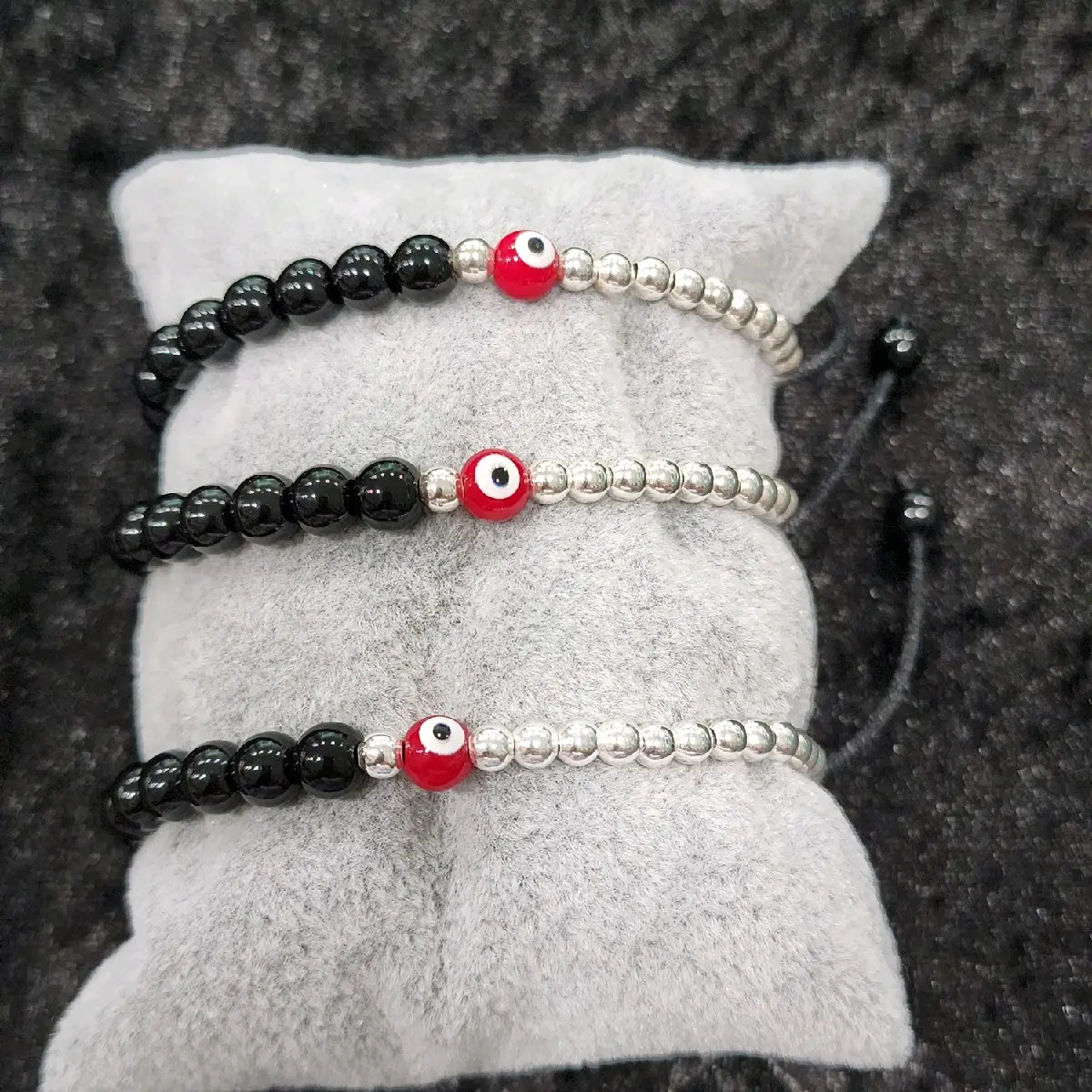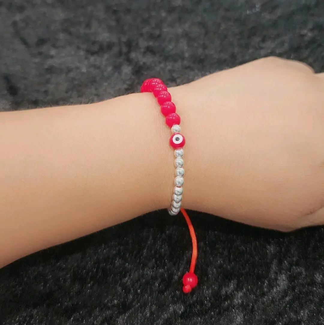 Pulsera tejida artesanalmente con ojo rojo o negro en plata .925 es ajustable unisex.Handcrafted woven bracelet with red or black eye in .925 silver is adjustable unisex.