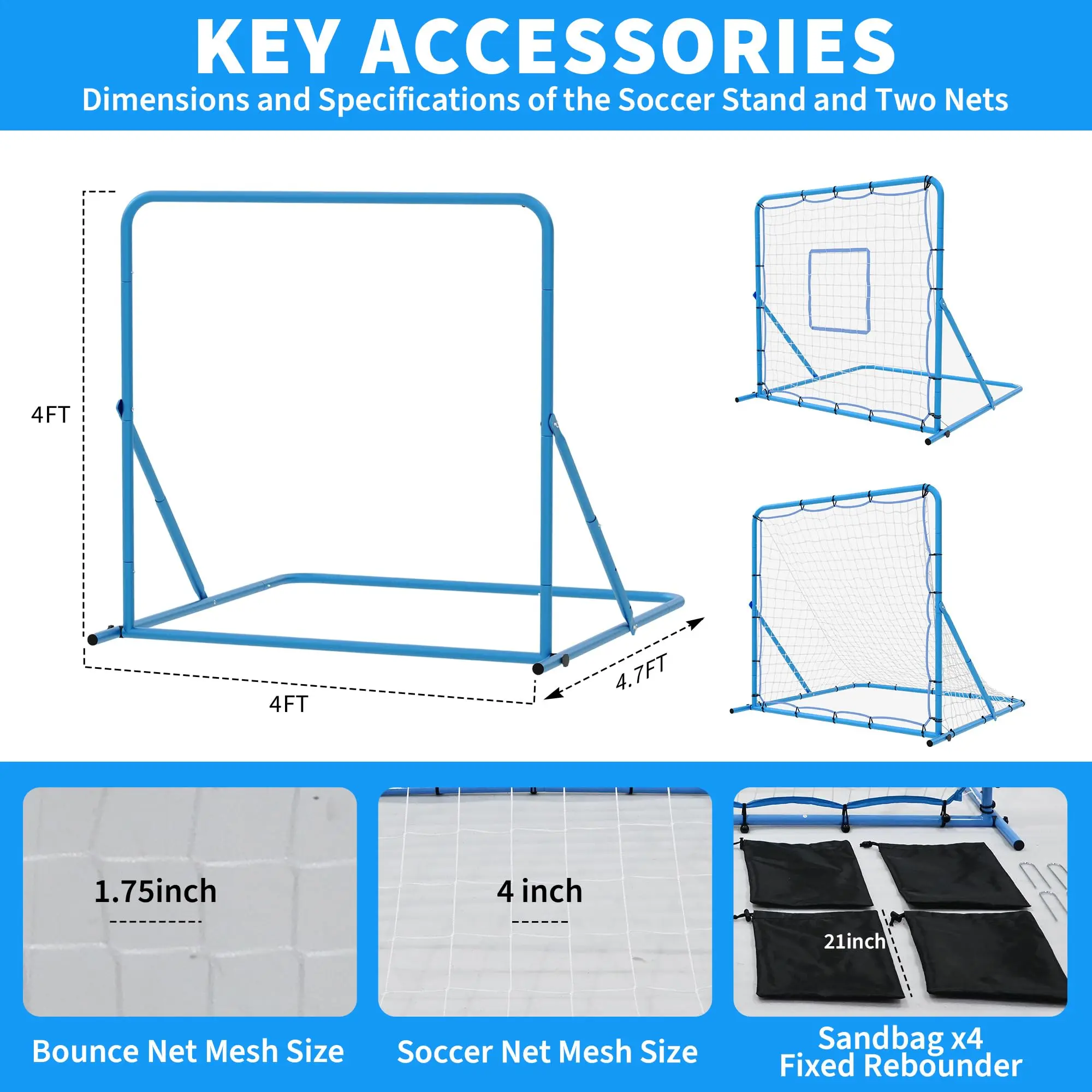 Robust & Stable Structure: Supported by a heavy-duty collapsible metal base coated with rust-proof black paint, this soccer goal also includes 14mm flexible fiberglass poles for extra reinforcement. Equipped with 4 ground stakes, it maintains strong stability on grass and performs reliably in all weather conditions.
