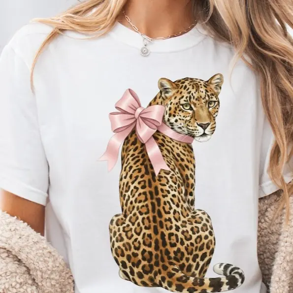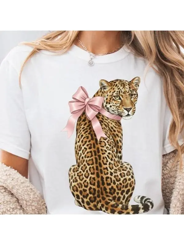 5. Pink leopard print top with bow, comfortable colored T-shirt, retro animal print.