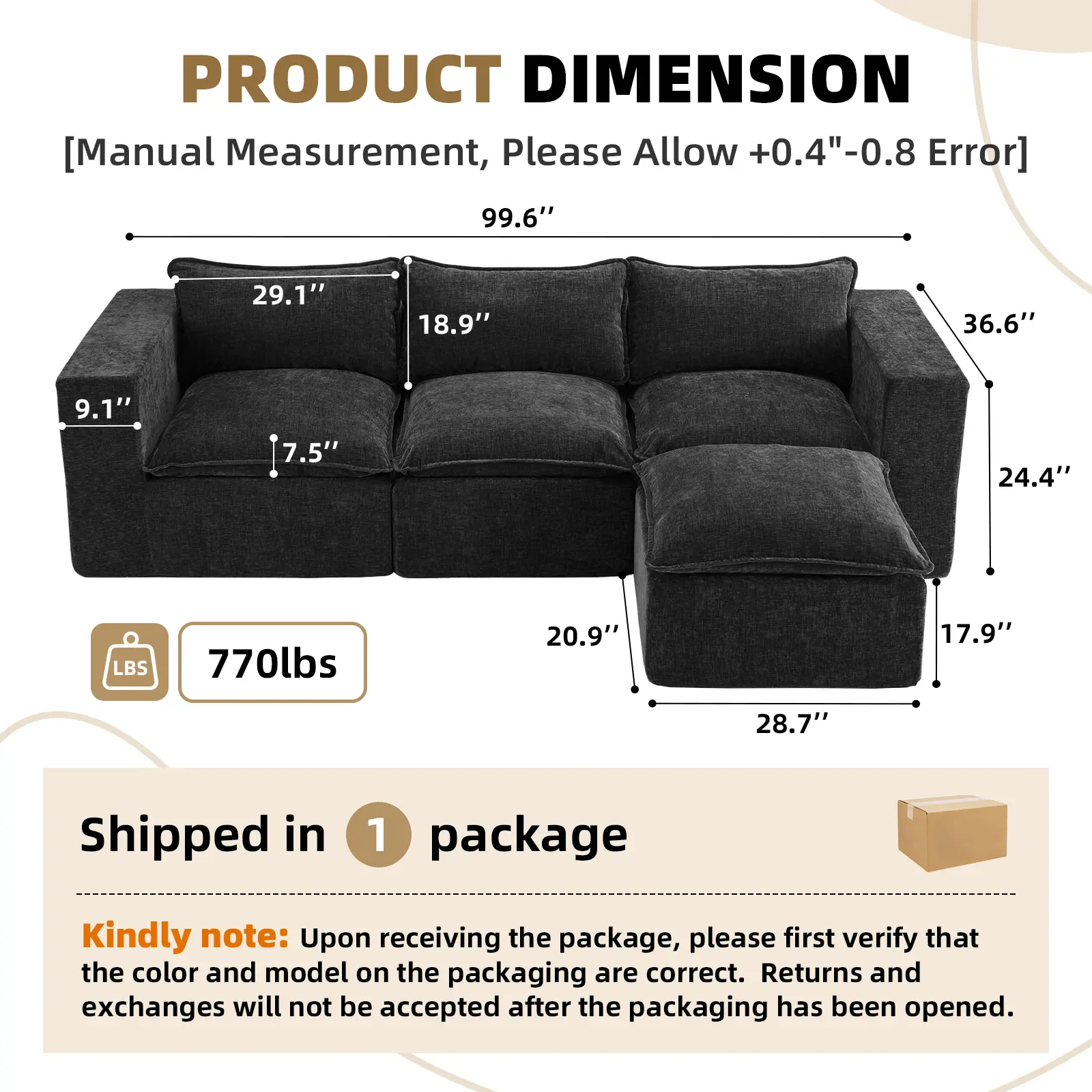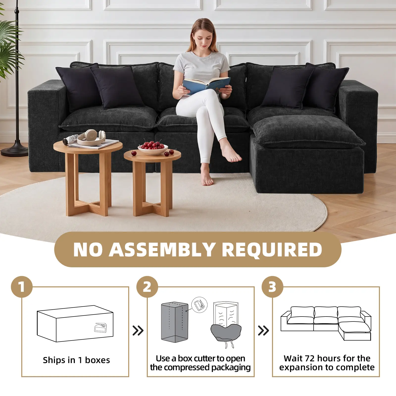 Skip the hassle of traditional furniture—no tools, screws, or complicated instructions needed. This sectional sofa arrives vacuum-packed for safe delivery and easy handling. Simply unbox, remove the packaging, and let each piece expand naturally. Within 72 hours, the cushions fully regain their shape and comfort. With no learning curve, it’s ideal for apartments, first homes, rentals, or housewarming gifts—effortless, intuitive, and stress-free from day one.