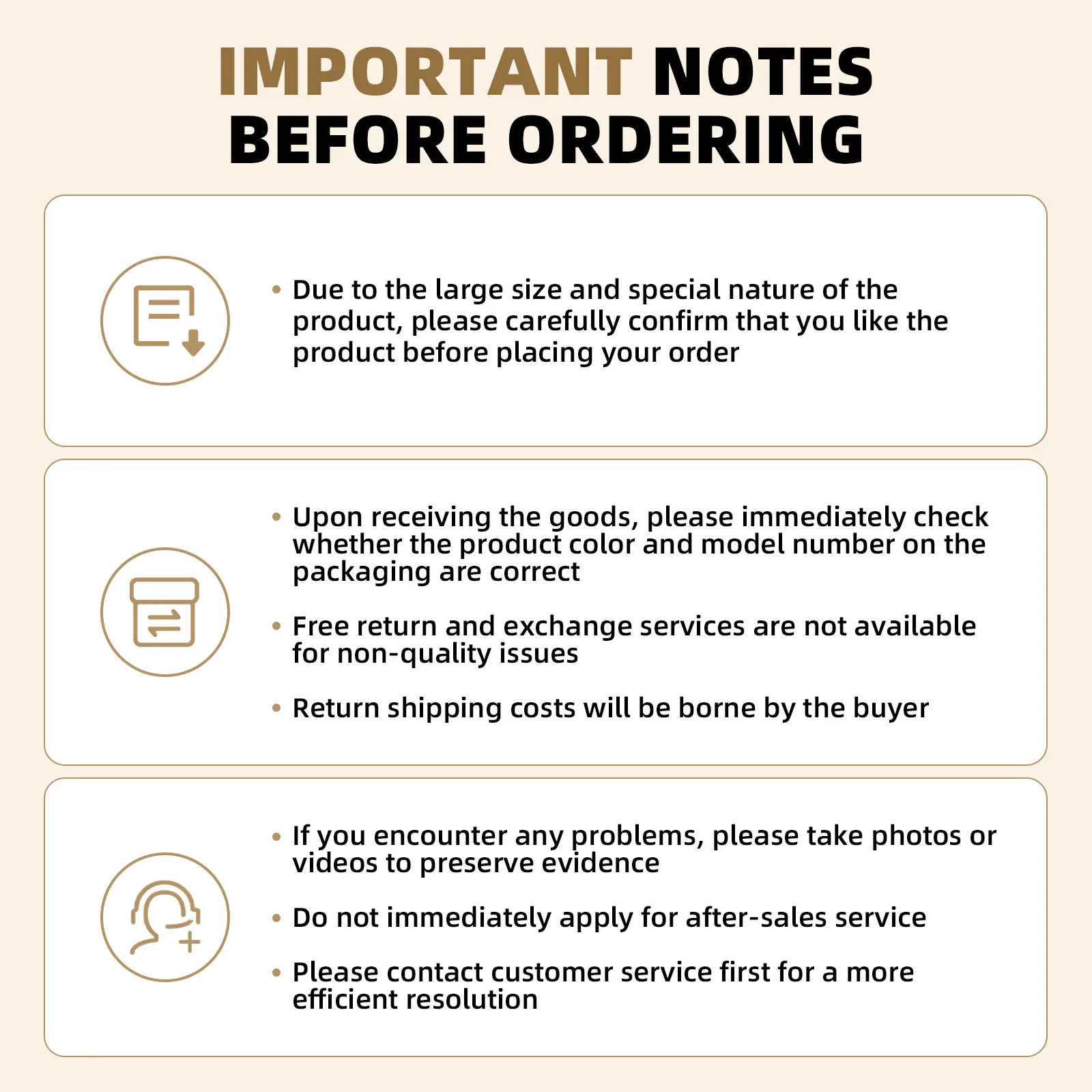 Please verify the color and style on the outer packaging before opening. If there is any discrepancy, contact customer support immediately and we will assist within 24 hours.