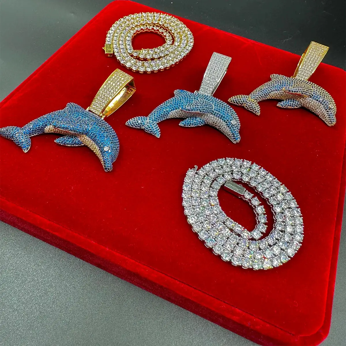 Iced Out Blue Dolphin Pendant Necklace Real Gold Plated Hip Hop Jewelry Unique Charms Trend