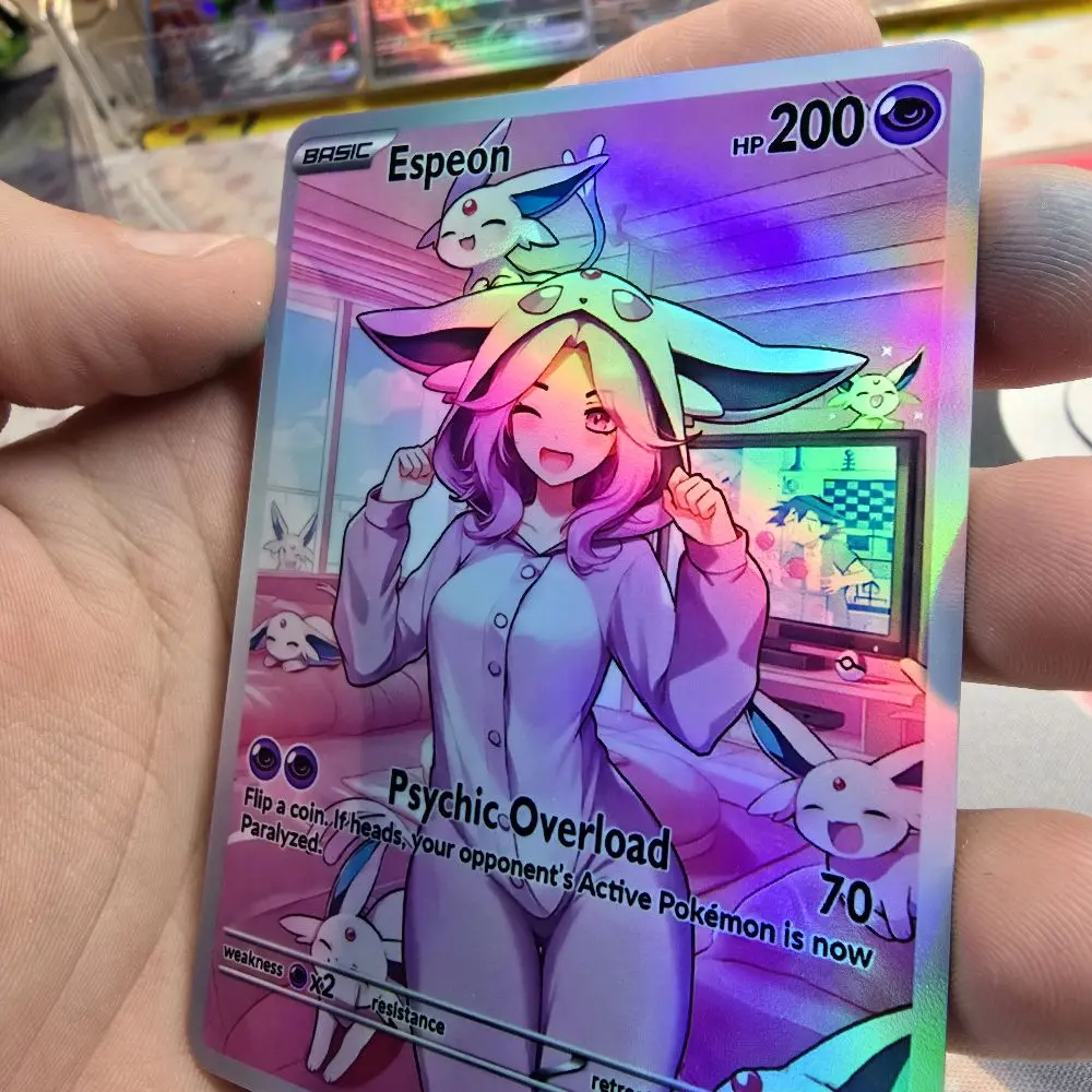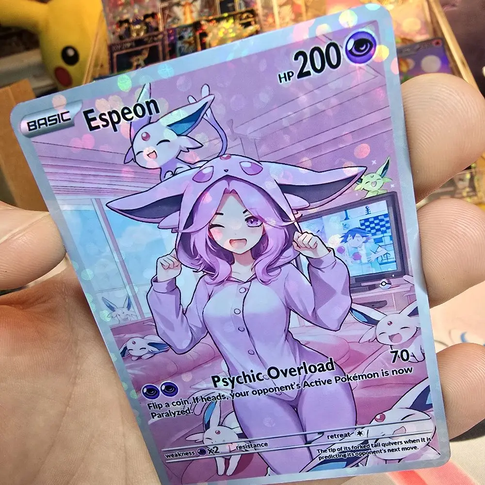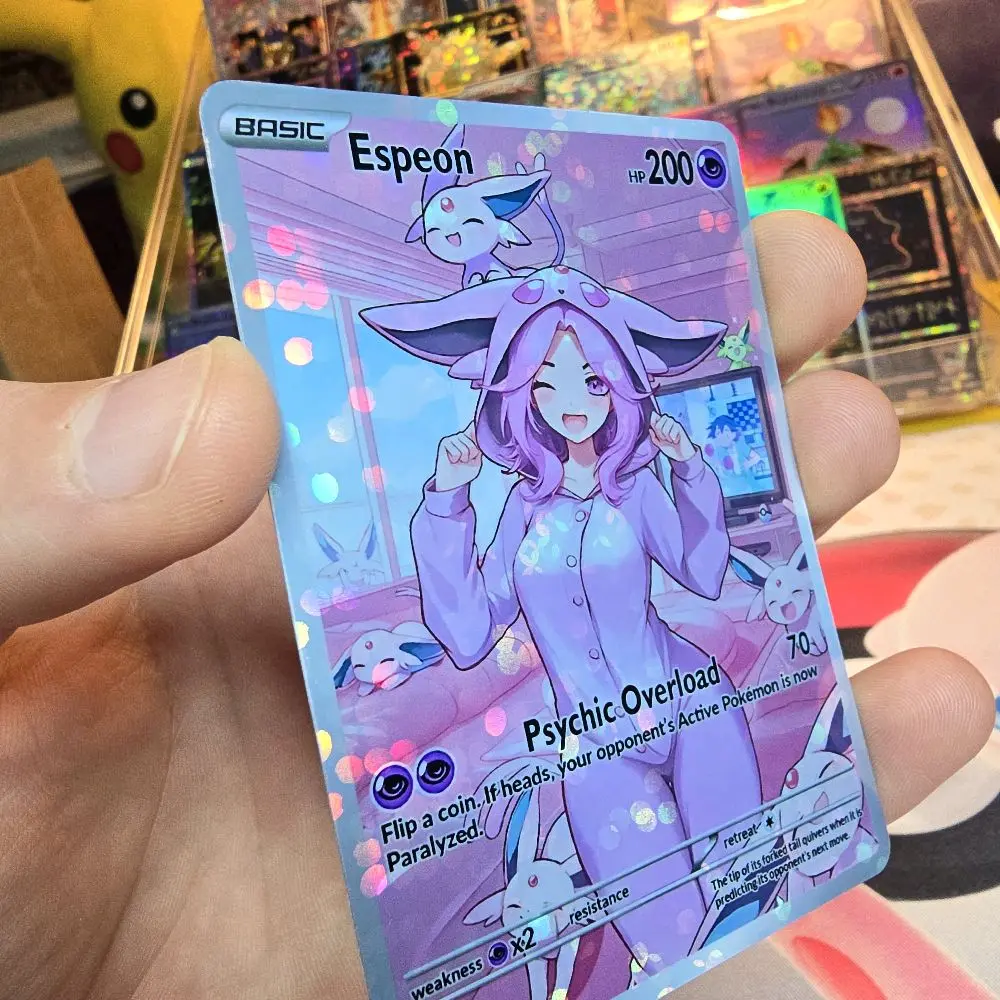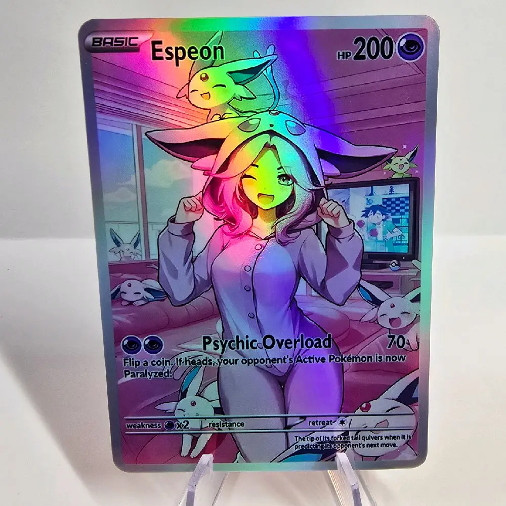 Part of the Cozy Slumber Series! This custom physical card features Eapeon in a relaxed, sleepover-themed art style. Finished with a premium Rainbow Holo or Confetti Holo that catches the light perfectly.
