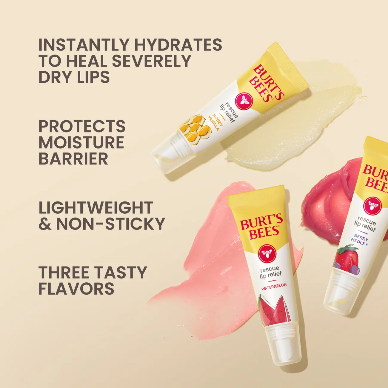 Burt’s Bees Rescue Lip Relief soothes your dry, chapped lips. This effective lip treatment is enriched with responsibly sourced beeswax, shea and cocoa butters to protect the lips’ natural moisture barrier. This nourishing formula is lightweight and is not sticky, so it’s easy to wear, and fun to swipe with a squeezy tube applicator. Plus, it comes in three delightful flavors: Honey Vanilla, Watermelon, Berry Medley.