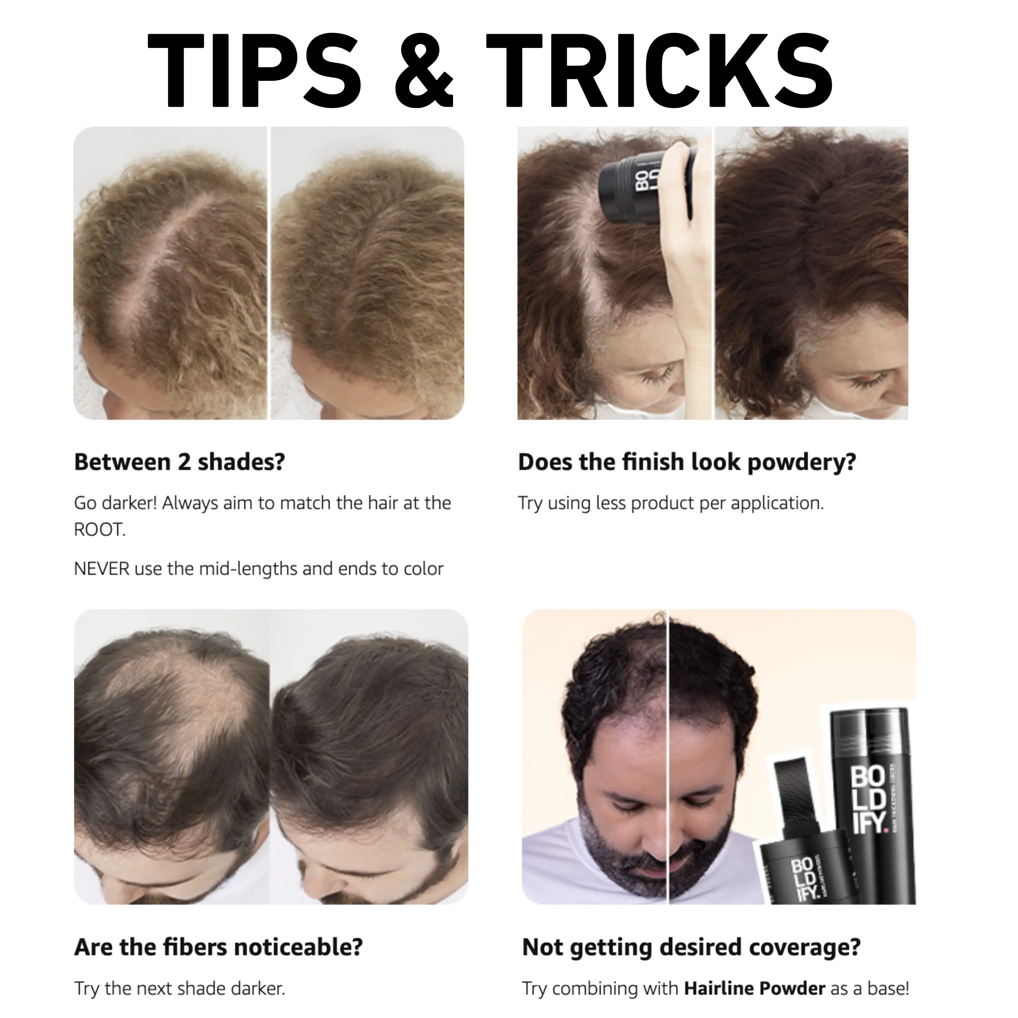 Our Hair Fibers are designed to provide natural-looking, buildable coverage for thinning hair when applied correctly and matched to the right tone. To help you find your perfect shade and get the best results, we offer a clear color wheel, step-by-step application guidance, and a Color Match Guarantee with free replacement or refund if your shade isn’t right.