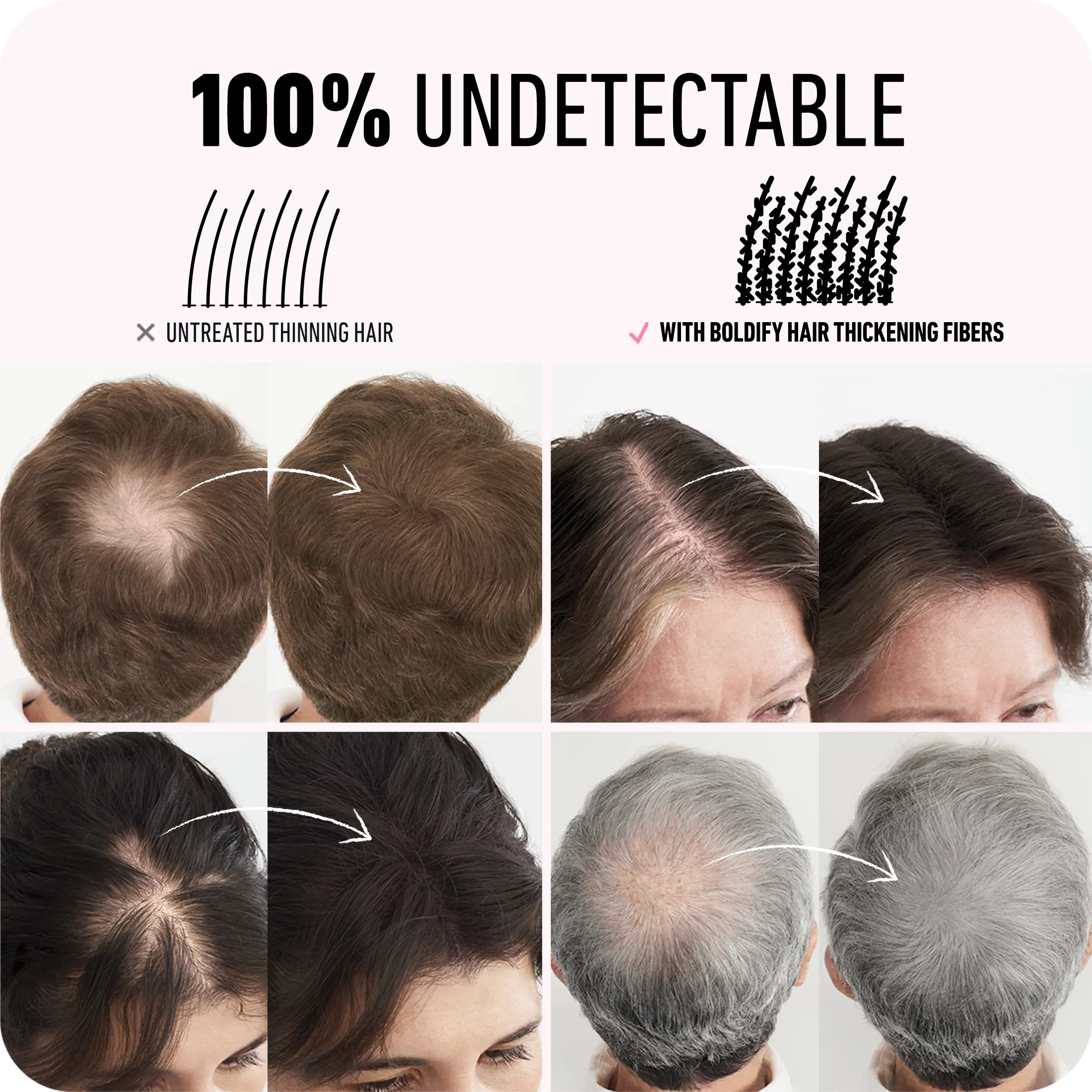 Boldify Hair Thickening Fibers help conceal the look of thinning hair by binding to existing strands for a natural, fuller appearance. Made from ultra-fine, plant-based fibers, they’re gentle on all hair and scalp types and designed for a soft, undetectable finish when built gradually.