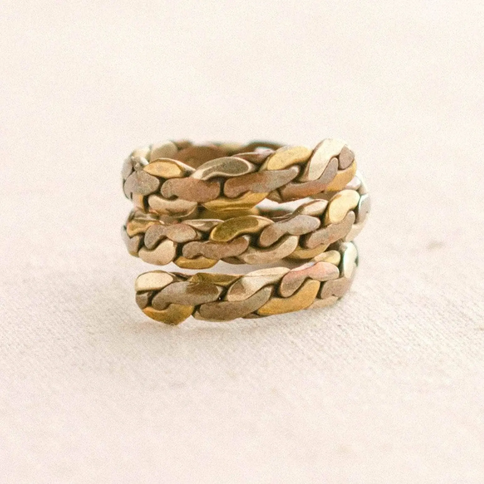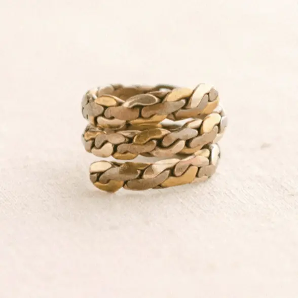 Aluminum too is a silver flash tonic for the system. Known for helping soothe the nervous system, this metal invites you to speak your truth and stand in your power. The meeting of these three entwined in this Tibetan Ring brings a flash of elemental healing to your hand, reminding you that natures raw energy can help us live a life of spiritual richness and physical strength.