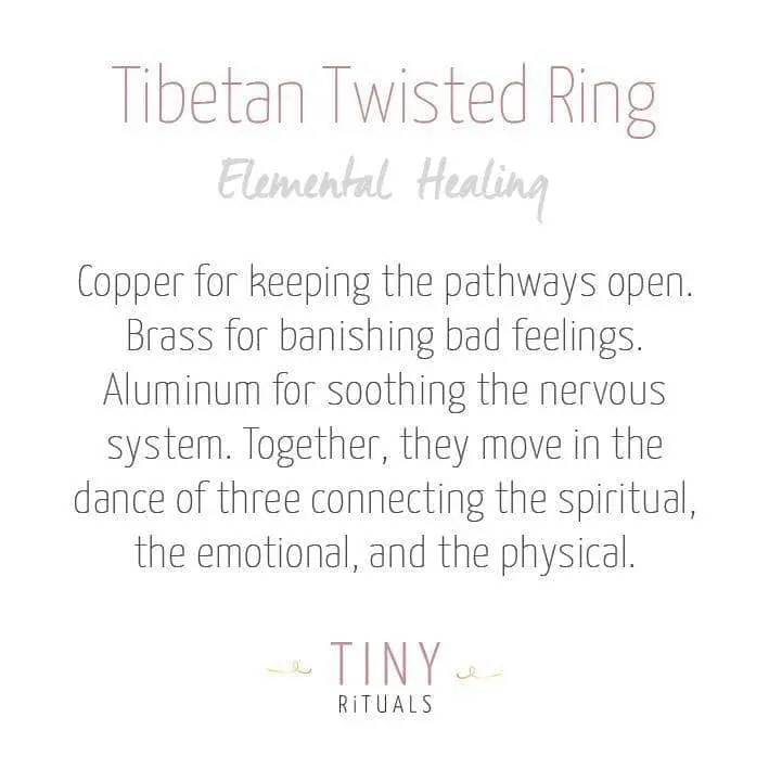 All the healing elements come together in this Tibetan Twisted Ring. The song of bright copper, the conductive beauty of brass, and the light love of Aluminum. Bringing into being the flow of healthy circulation, the harmony of energy, and Tibetan ritual for bringing strength to the body, mind, and soul – this ring is radiant with life’s vitality.