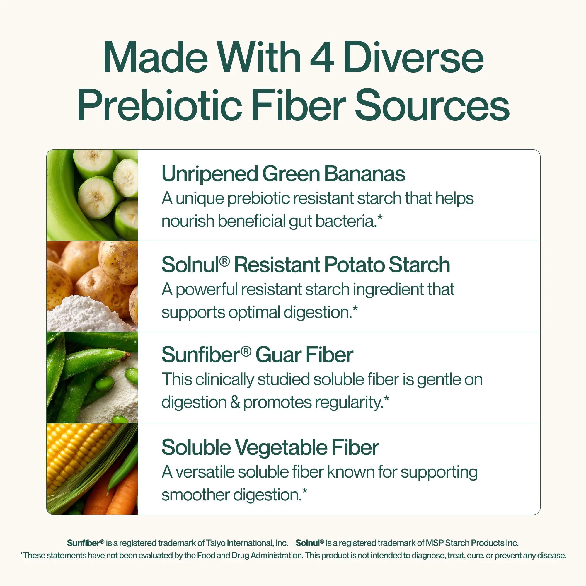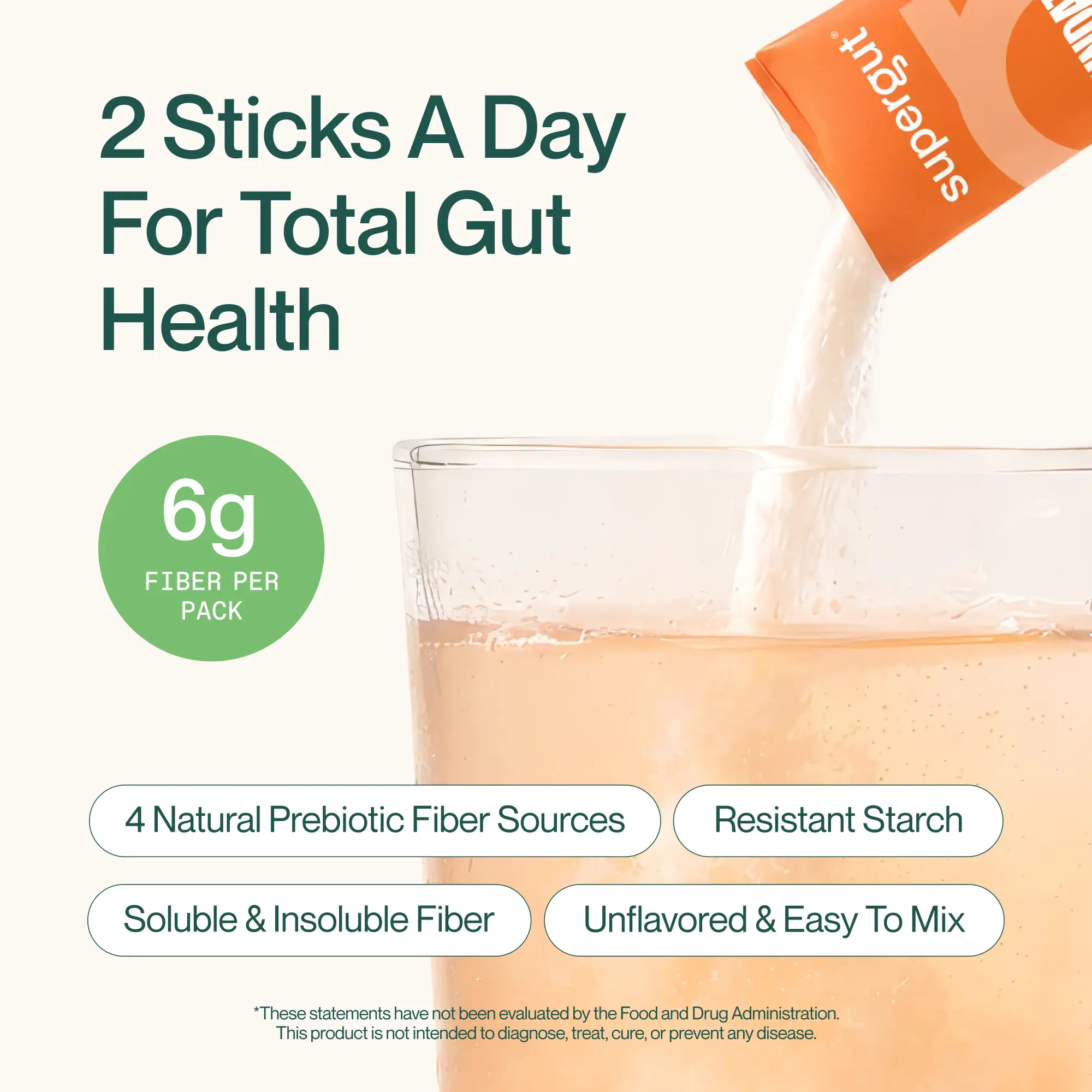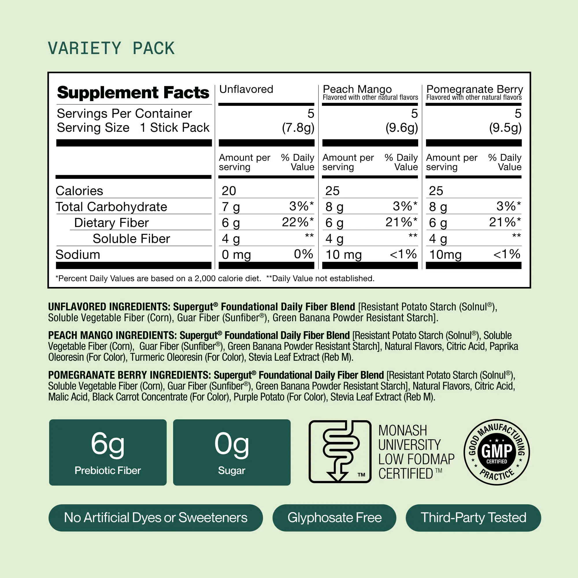 6g Fiber Per Serving: Supergut Foundational Daily Fiber Variety Pack features a blend of 4 diverse prebiotic fiber sources, including Sunfiber, Solnul resistant potato starch, green banana resistant starch, and soluble vegetable fiber. Each stick pack provides 6g of prebiotic fiber to support digestive health, promote regularity, and optimize a healthy gut microbiome.