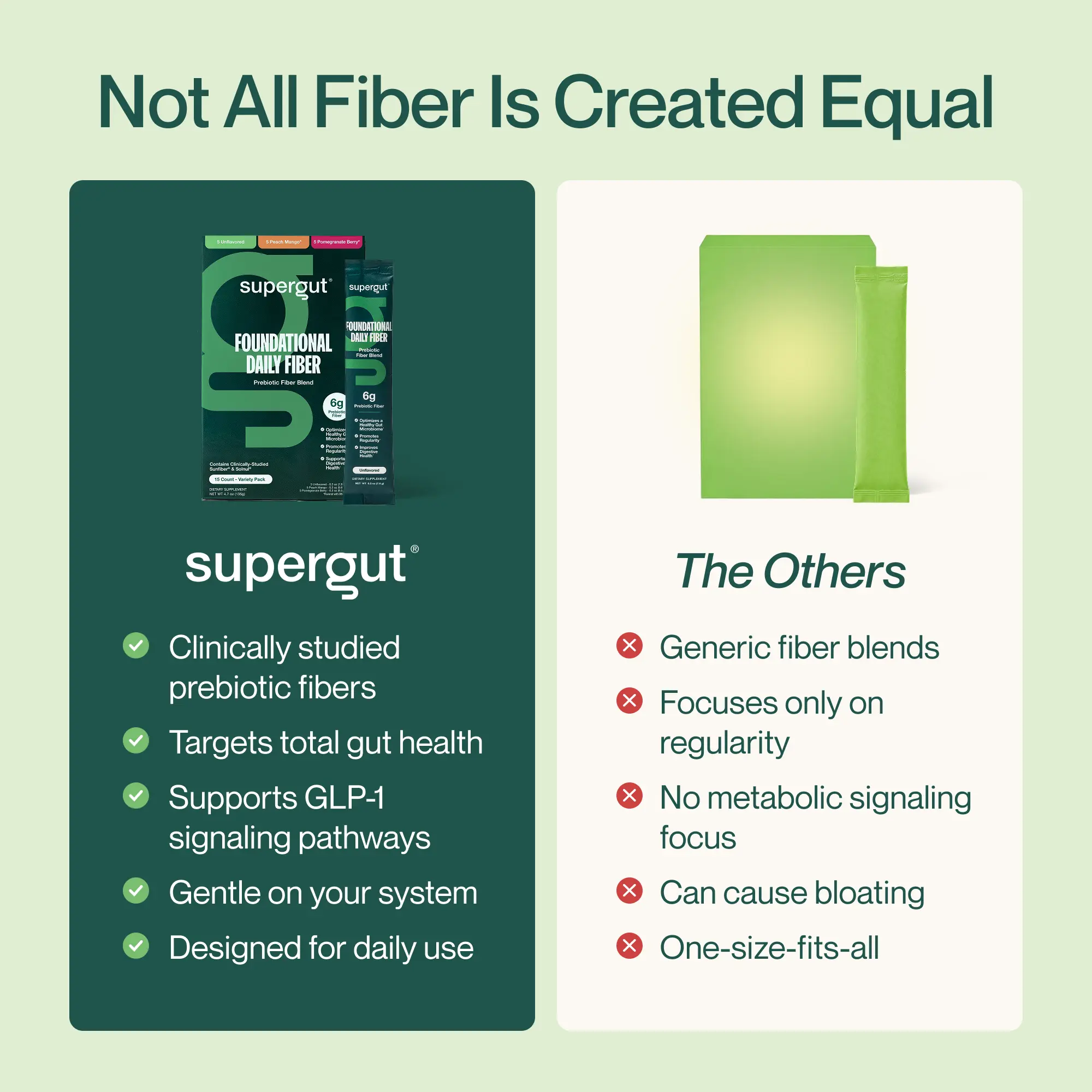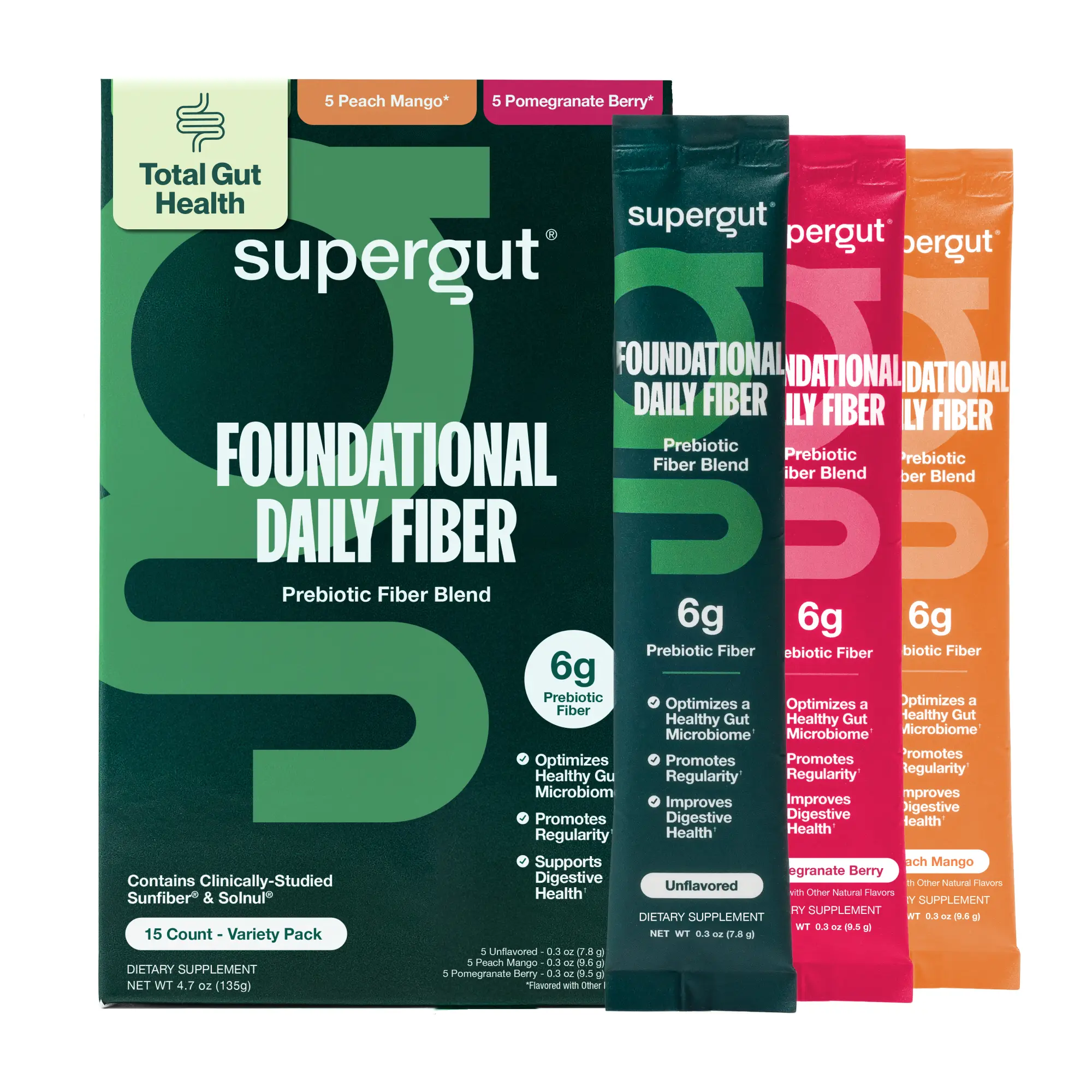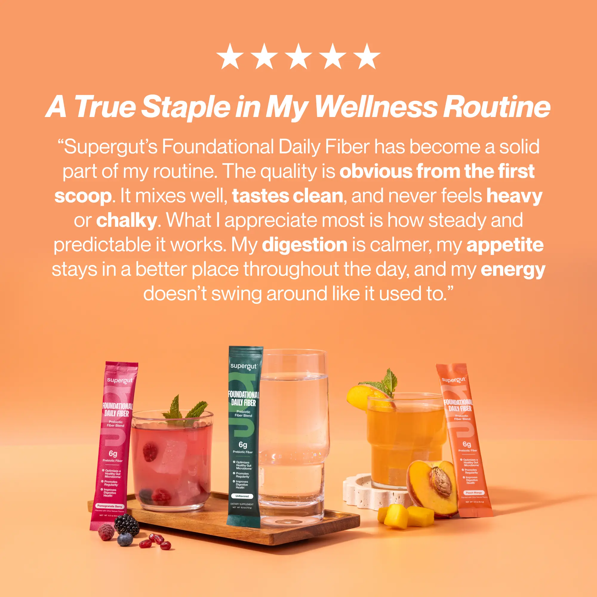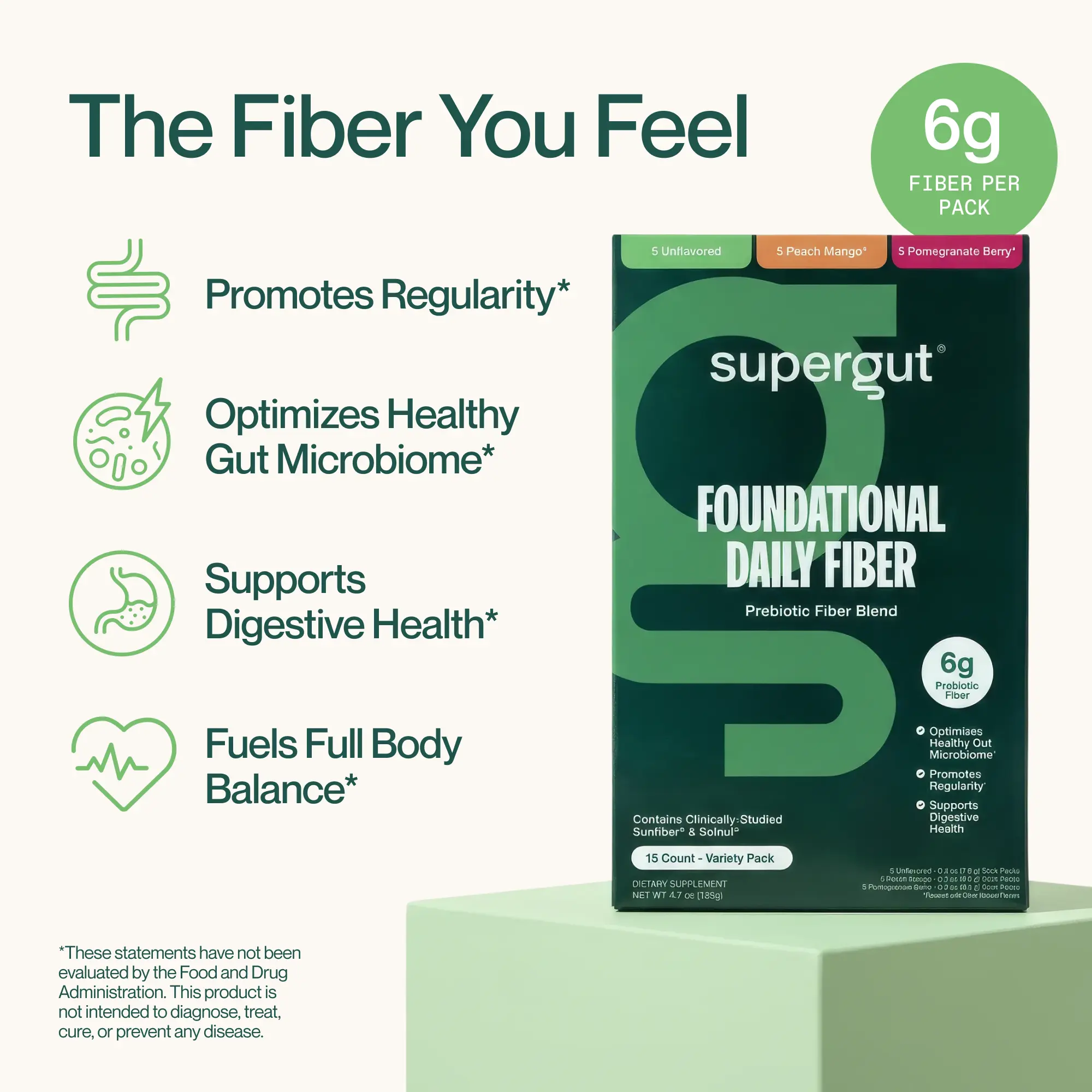 Packaged in portable stick packs, Supergut Foundational Daily Fiber Variety Pack fits easily into your desk drawer, gym bag, suitcase, or everyday routine. Just tear, mix, and enjoy convenient daily fiber support wherever you go.