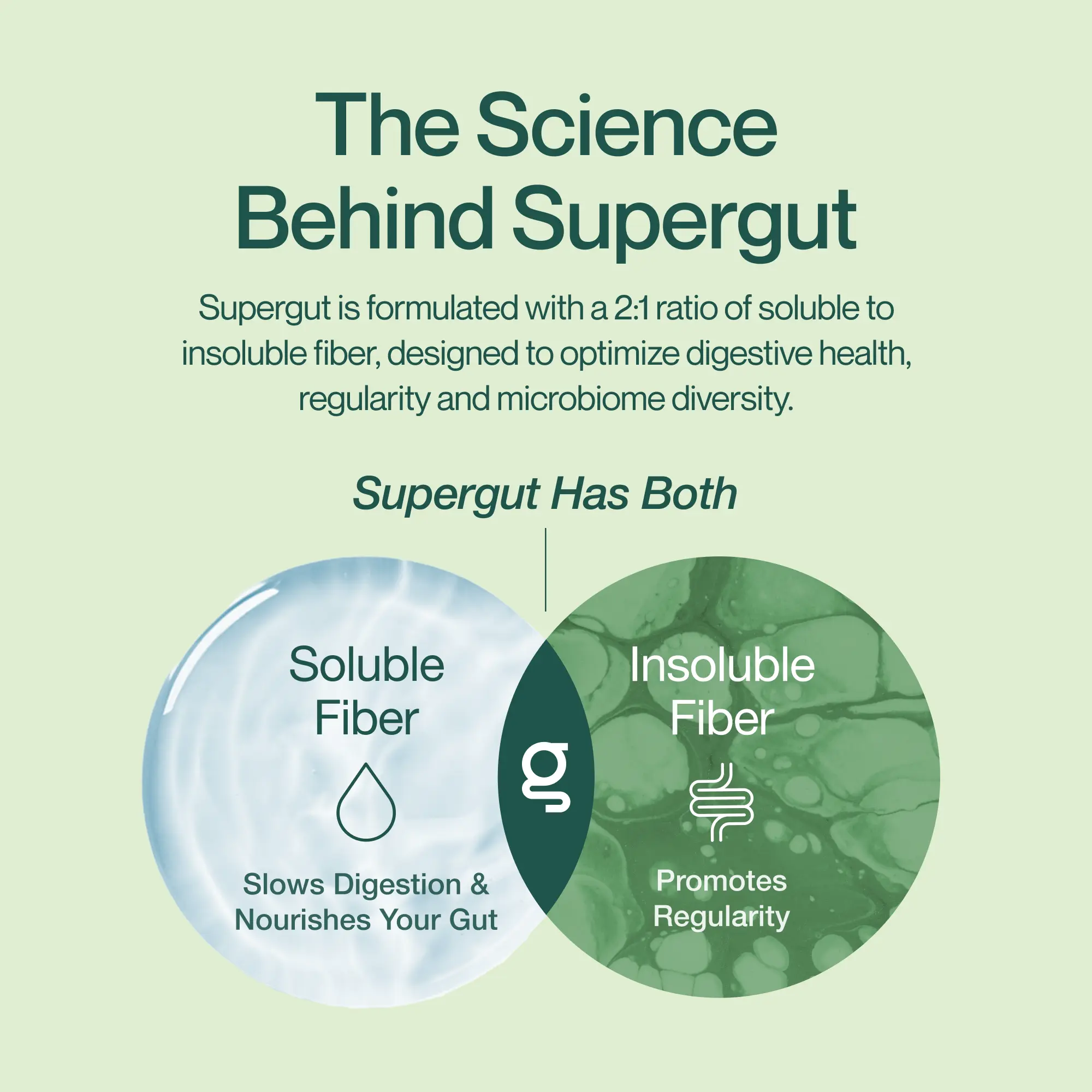 Supergut is formulated with a 2:1 ratio of soluble to insoluble fiber to support total gut health. This prebiotic fiber blend helps nourish beneficial gut bacteria, support digestive balance, and promote regularity with daily use.