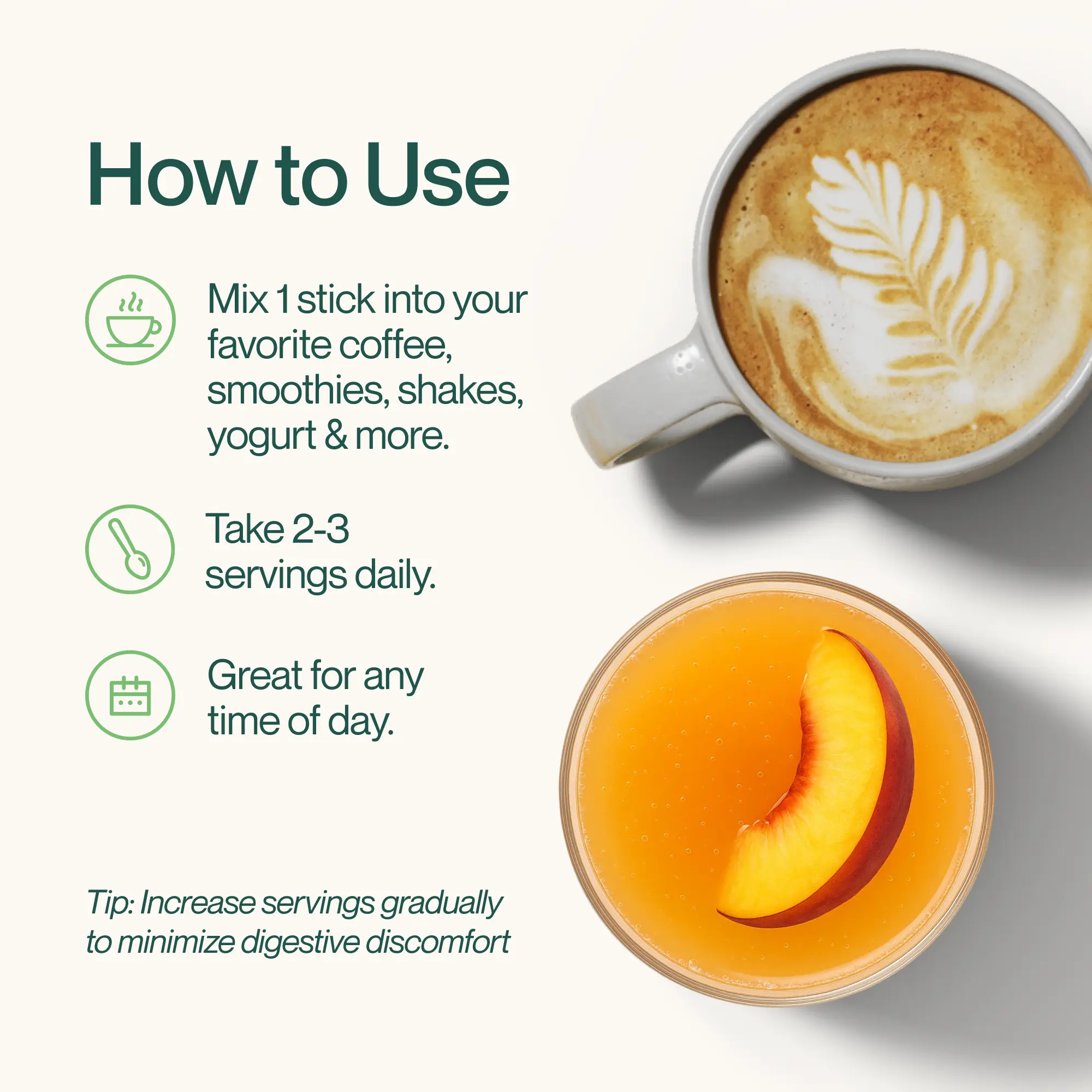 Mix 1 stick pack into water, coffee, smoothies, shakes, yogurt, or more. Take 2–3 servings daily and increase gradually to help minimize digestive discomfort. The Variety Pack includes Unflavored, Peach Mango, and Pomegranate Berry stick packs.