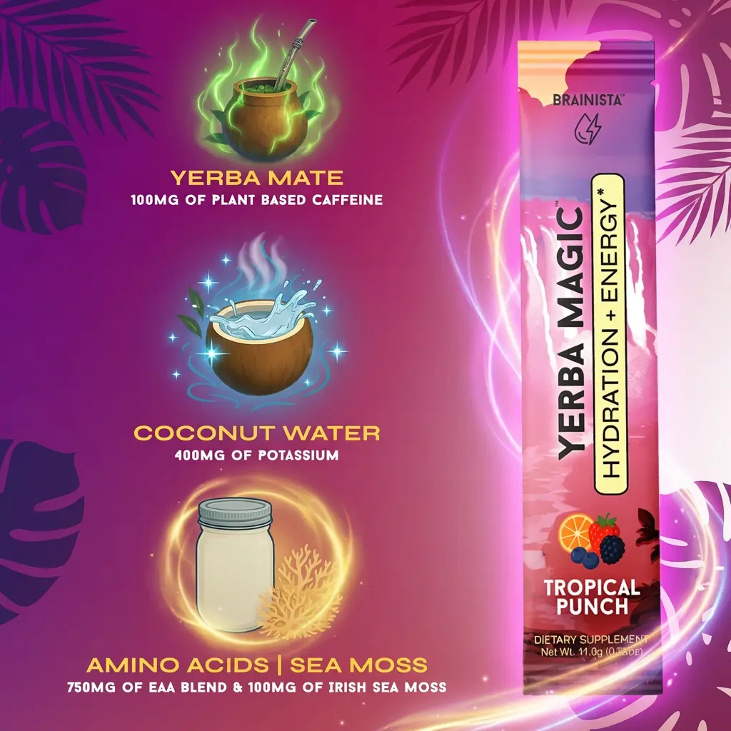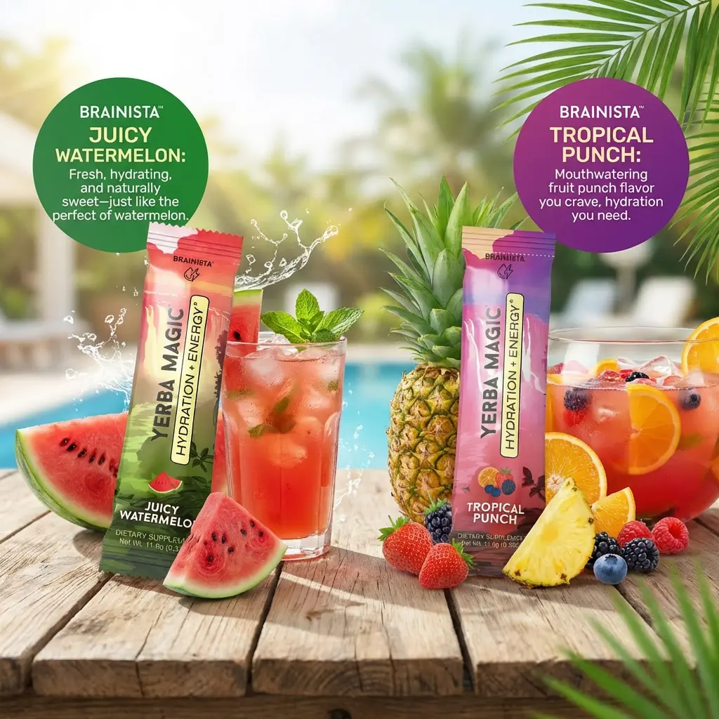 The Yerba Magic Energy + Hydration Bundle includes both refreshing flavors — Tropical Punch and Juicy Watermelon — formulated to help support hydration, natural energy, and daily recovery wherever you go.
