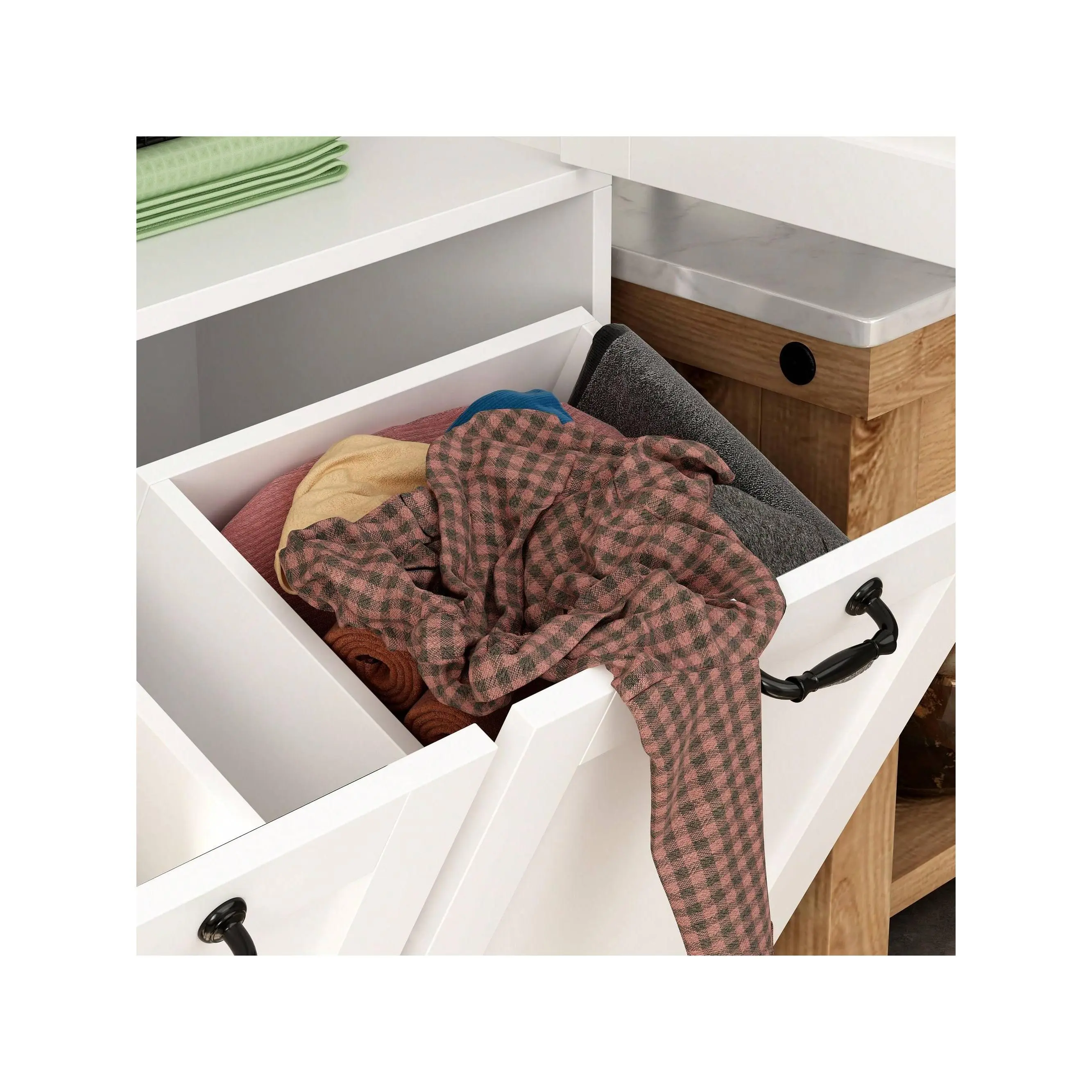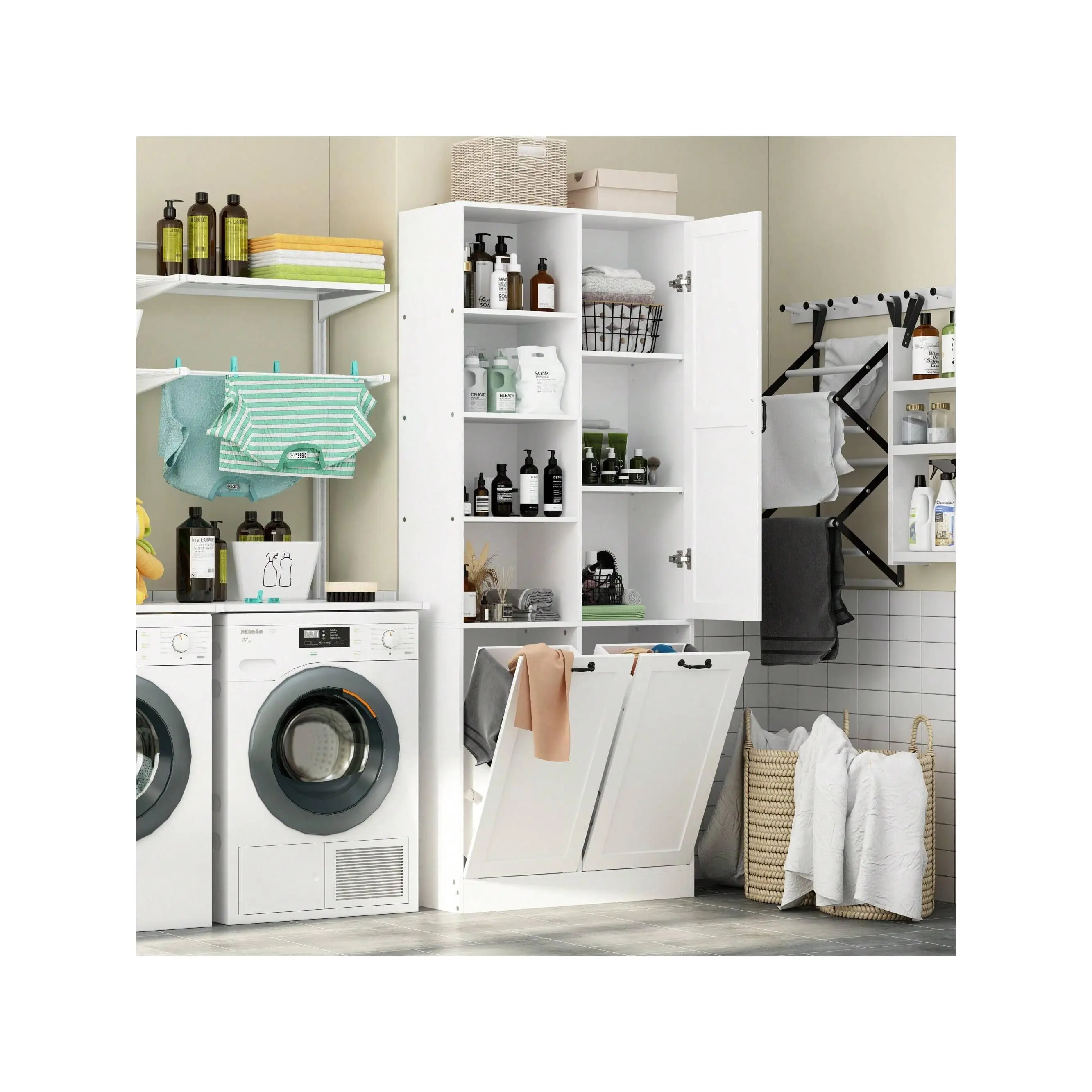 ·Improve Place Tidiness - Multi-layer design allows messy objects to have their own location. Hide the laundry hamper under the wooden cabinet to perfectly blend with your furniture. Easily keep the lautry room or bathroom tidy and delicate