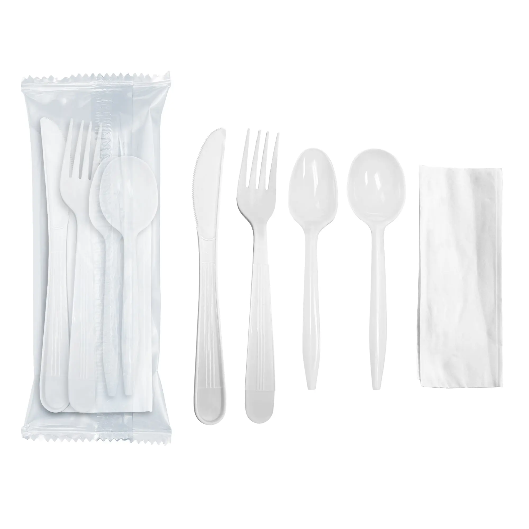 Individually Packed: 1 heavy weight fork, 1 heavy weight knife, 1 medium weight soup spoon, 1 medium weight teaspoon, 1 napkin (1 Guest)