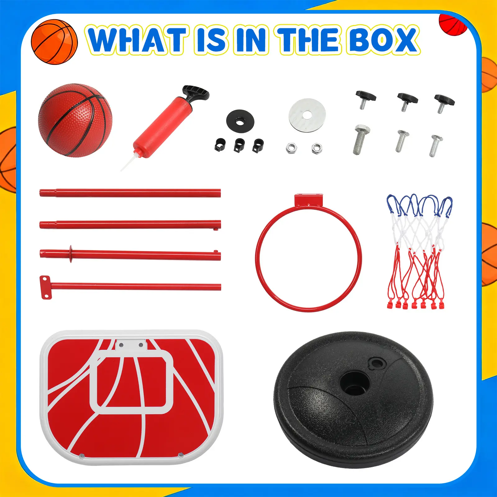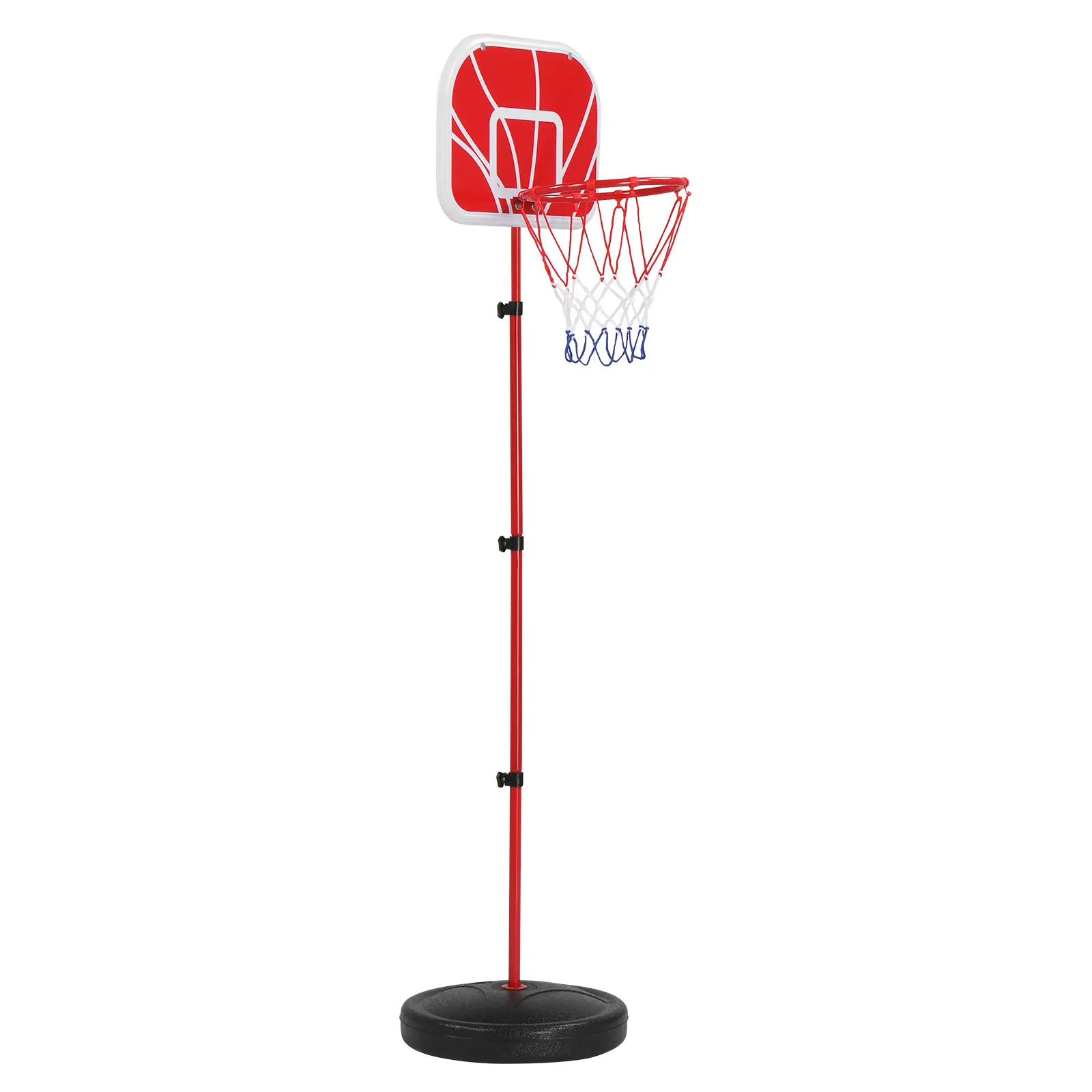 This kids basketball hoop features adjustable height from 58cm to 144cm, perfect for toddlers and growing children. Made of safe and durable HDPE material in bright red, it is stable and long-lasting. The portable design allows for both indoor and outdoor use, great for home, backyard, and playground. It helps improve exercise, coordination and confidence in children. Ideal sports gift for boys and girls.