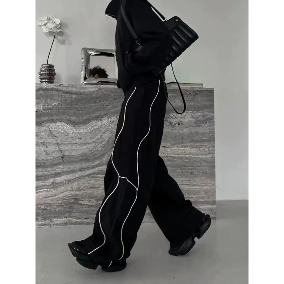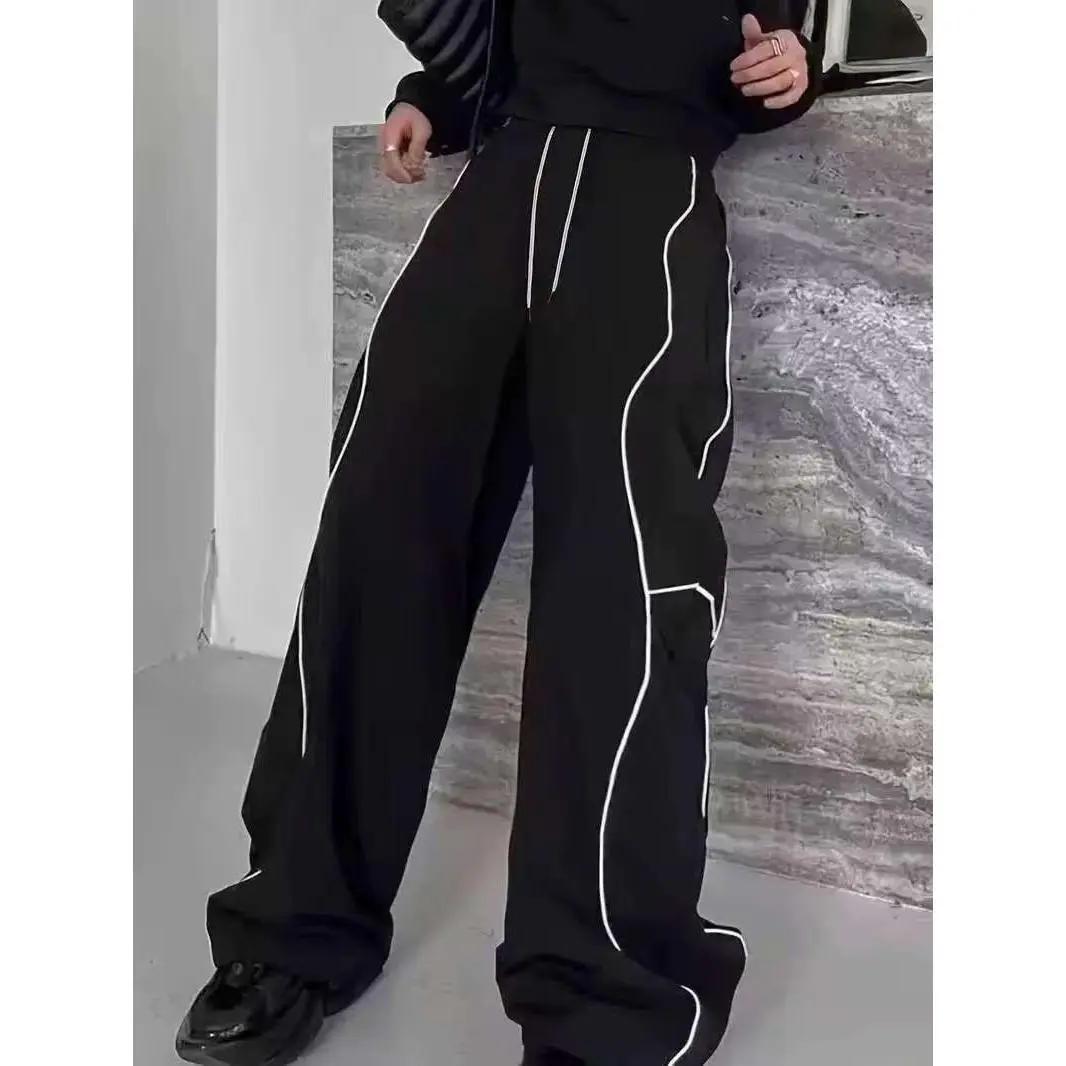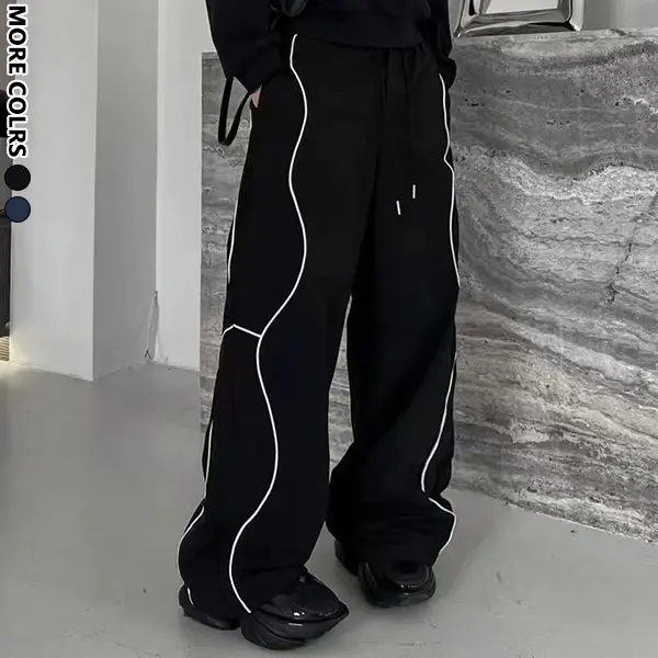 🌟 Black Curved Piping Wide-Leg Sweatpants | Streetwear Bottoms 🌟