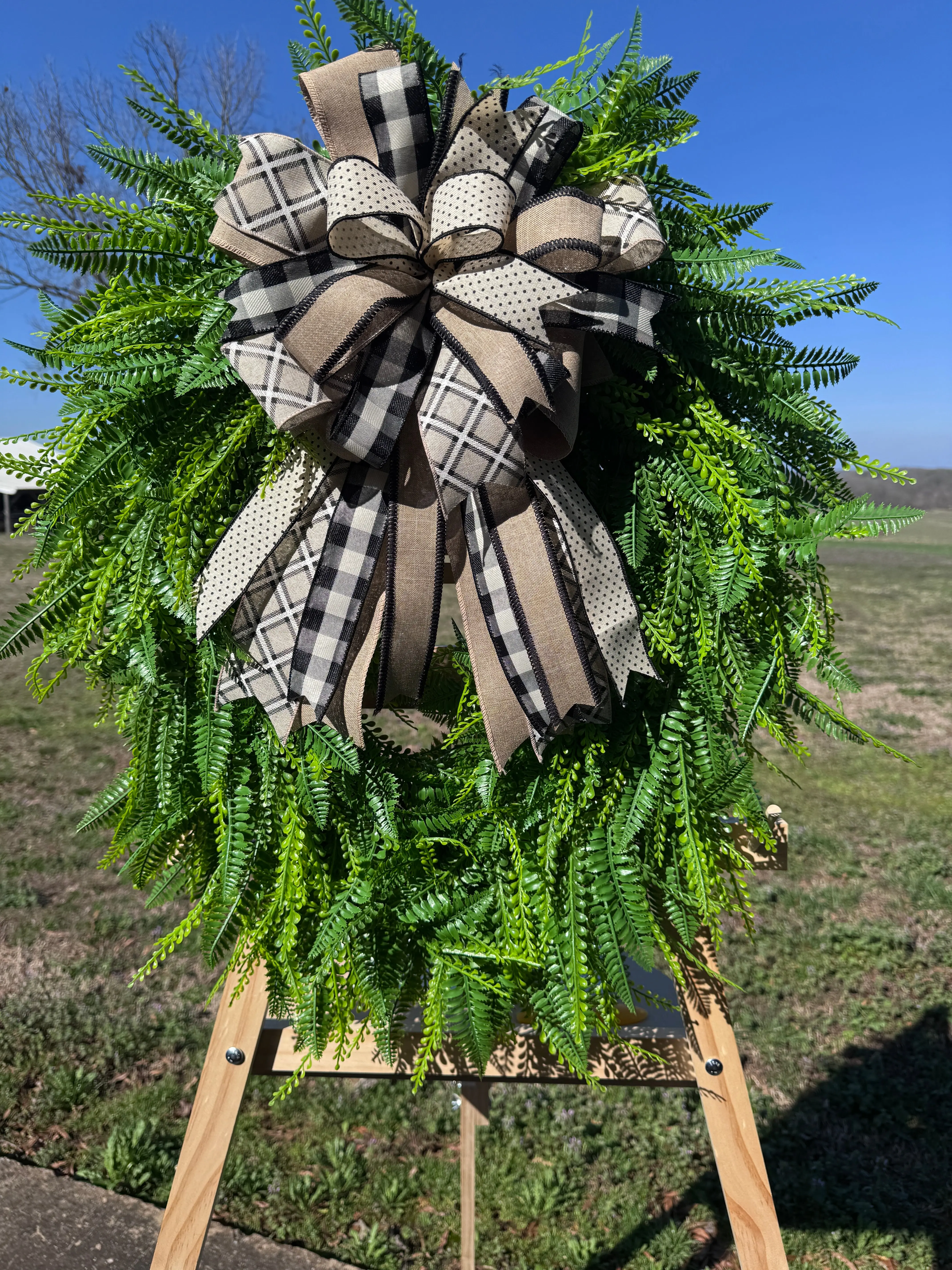 Add a beautiful designer touch to your front door wreath with this handcrafted farmhouse wreath bow featuring classic black and tan neutral ribbons.