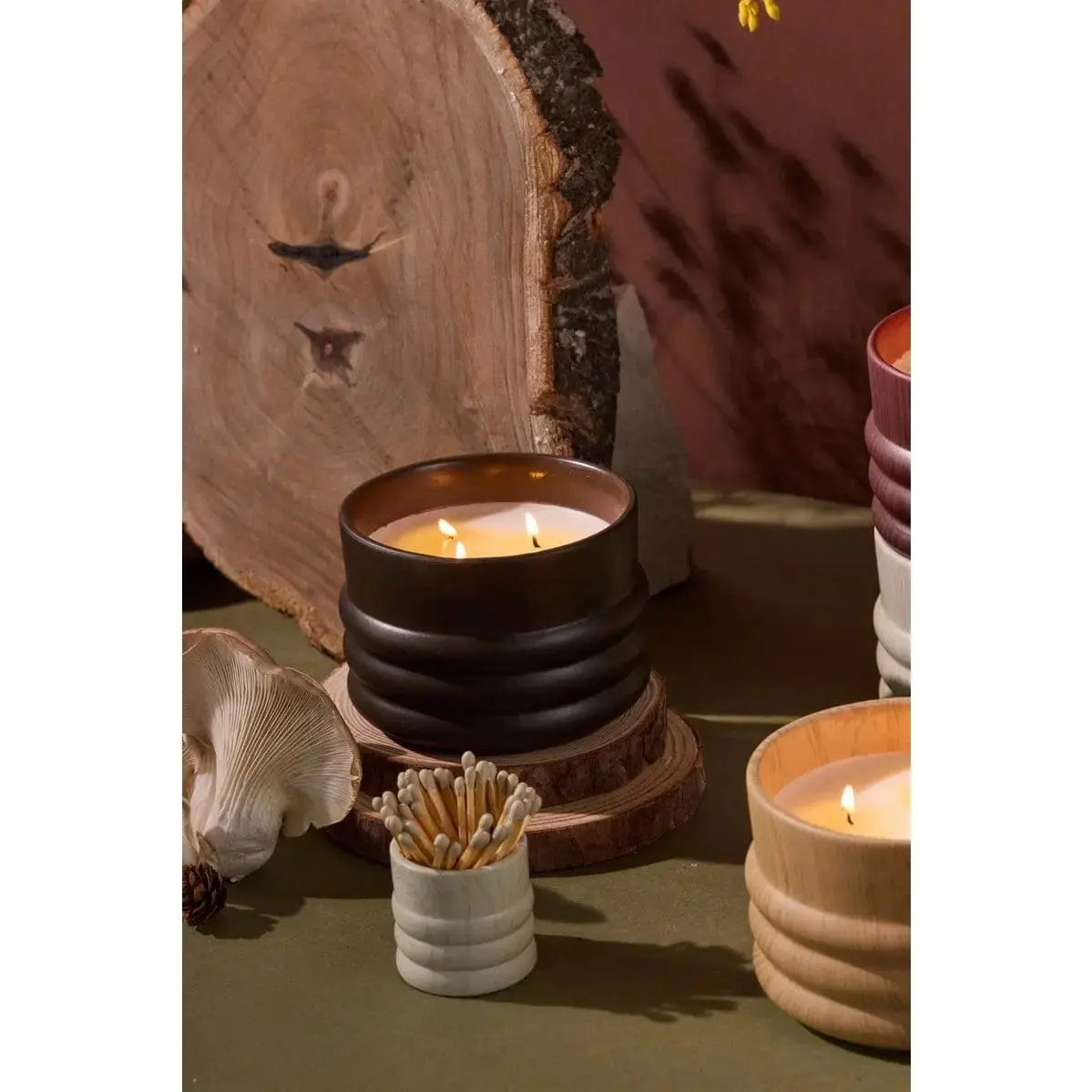 Bring the outdoors in and get cozy this season with our new Grain collection inspired by the beauty of woodgrain. Ceramic two-wick candles are filled with our warmest, woodiest scents - noted on the dustcovers which are diecut to resemble wood slices. Coordinating match holders, which are available in three colors, come packaged in a kraft box and include 50 safety matches with colored tips.
