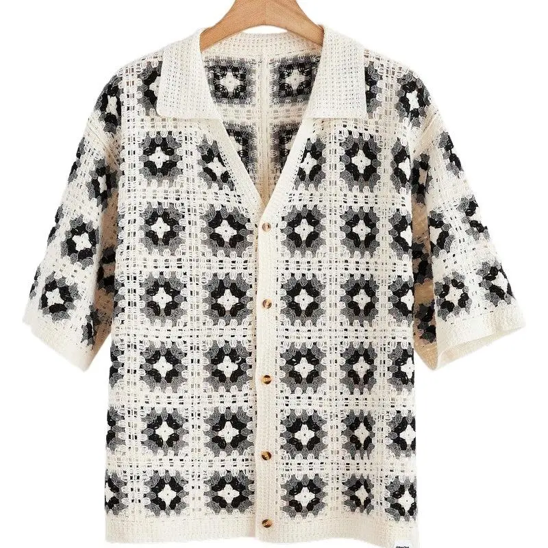5. Men's Summer Cool Knitted Short-Sleeve Spring Shirt, Off-White Bohemian Style Vacation Casual Loose Lapel Button-Down Open Placket Print