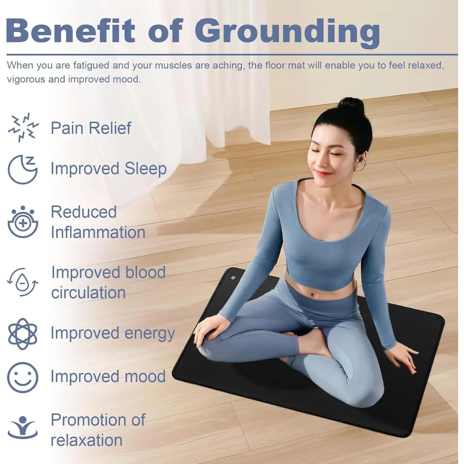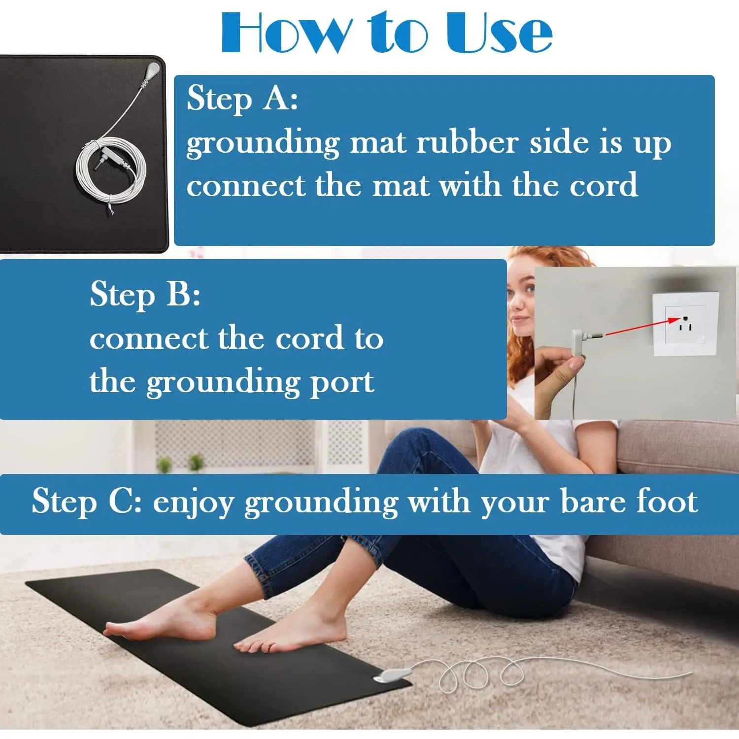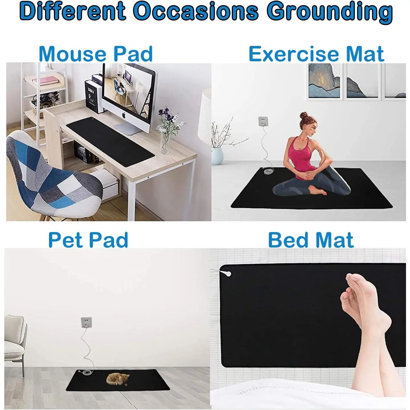 BENEFITS OF GROUNDING: Grounding can provide health benefits, such as better sleep, reduced stress, reduced inflammation, headaches or tension, improved blood circulation, and more energy.The grounding mat could be used as a mouse mat, foot mat, and bed mat.You could feel grounding anytime.HIGH-QUALITY MATERIALS: The grounding mat is made of Conductivity carbon fiber and PU, an environmentally friendly non-toxic material.2 pieces 13in * 23.6in and 2 grounding wires.HOW TO USE: Just plug the buckle-type power cord into the grounding socket of the wall power outlet.The grounding pad can be used on the floor, under the table, on the bed, on the top of the table, or any place you like.Importantly, with bare skin touching enjoy the grounding.CAREFUL CARE: The grounding mat can be used as a gift for ourselves or loved ones.We need to feel the healthy energy given to us by nature.Let our lovers also feel the energy from the Earth and love from us.CONTACT US: You can contact us at any time if you have any questions, we hope that you are healthy and happy.