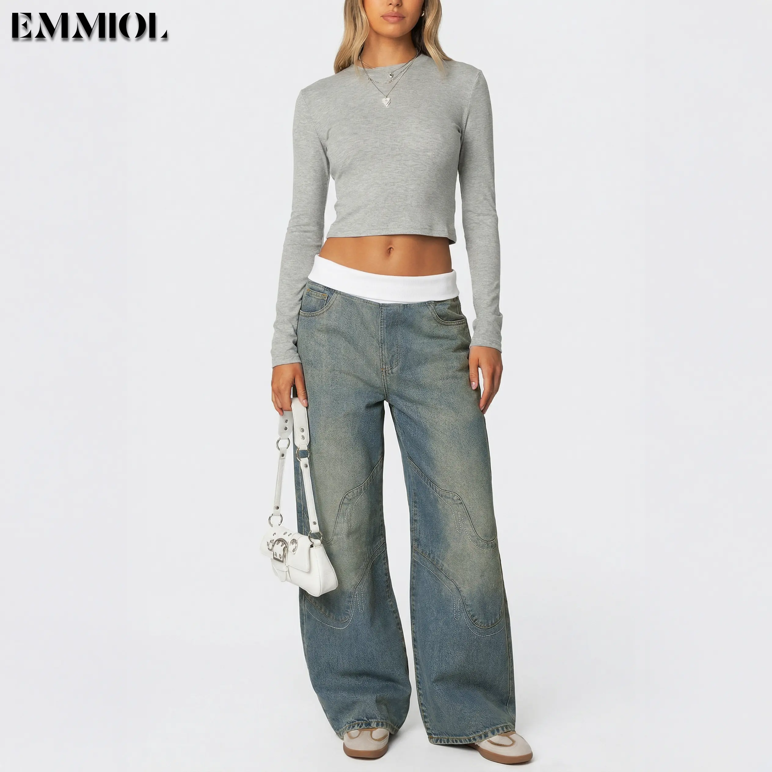 EMMIOL Women Y2K 90S Hip Hop Baggy Jeans Boyfriend Wide Leg Denim Pants Mid-High Rise Loose Streetwear Outfits