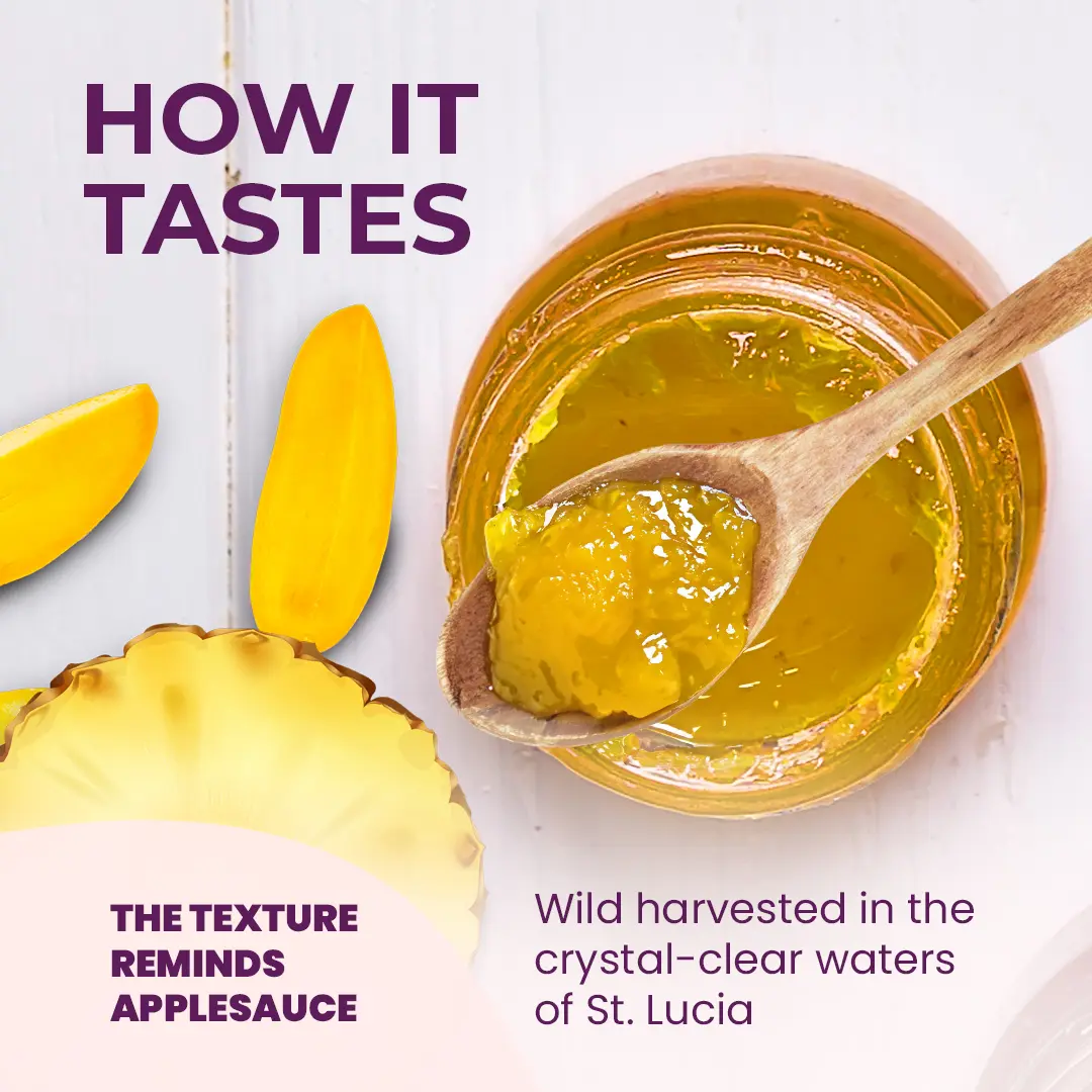 Savor the tropical bliss of sweet mango and pineapple harmoniously blended with sea moss and monk fruit, creating a refreshing, flavor-packed experience that supports your health from the inside out.