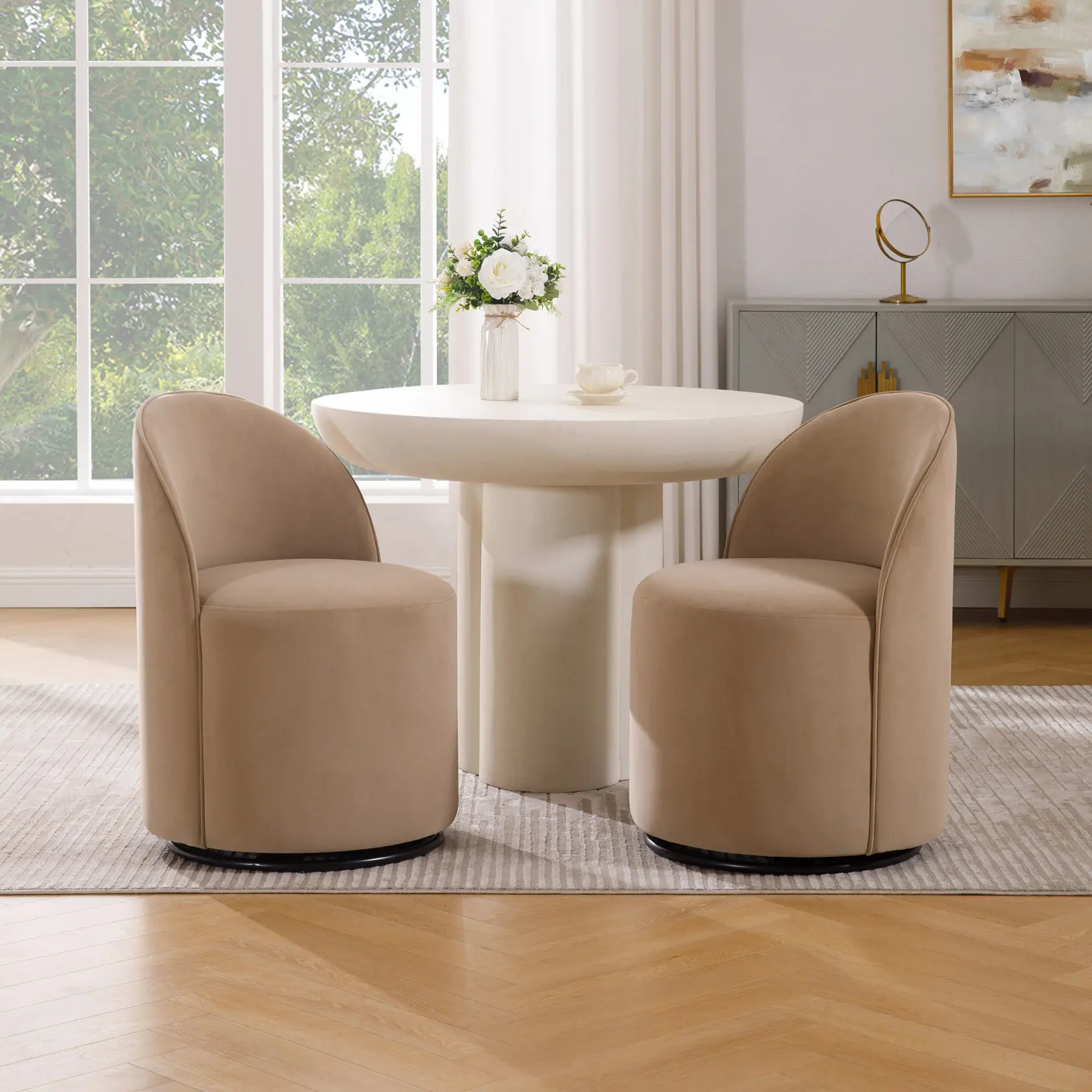 Upholstered in soft, durable velvet, this swivel chair delivers everyday comfort with a refined look. The fabric feels cozy yet practical, making it ideal for daily meals, entertaining guests, or extended conversations around the table.