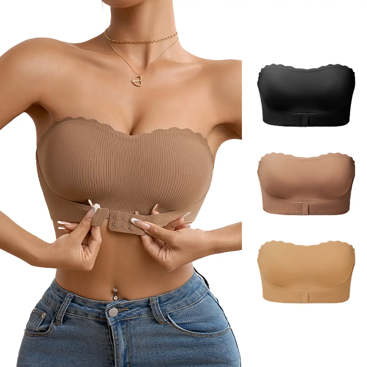 This 3-pack of front-closure bandeau bras features a sleek, wire-free fit with a flirty wavy edge trim. Designed to be breathable, stretchy, and smooth, these bras offer all-day comfort without sacrificing style.