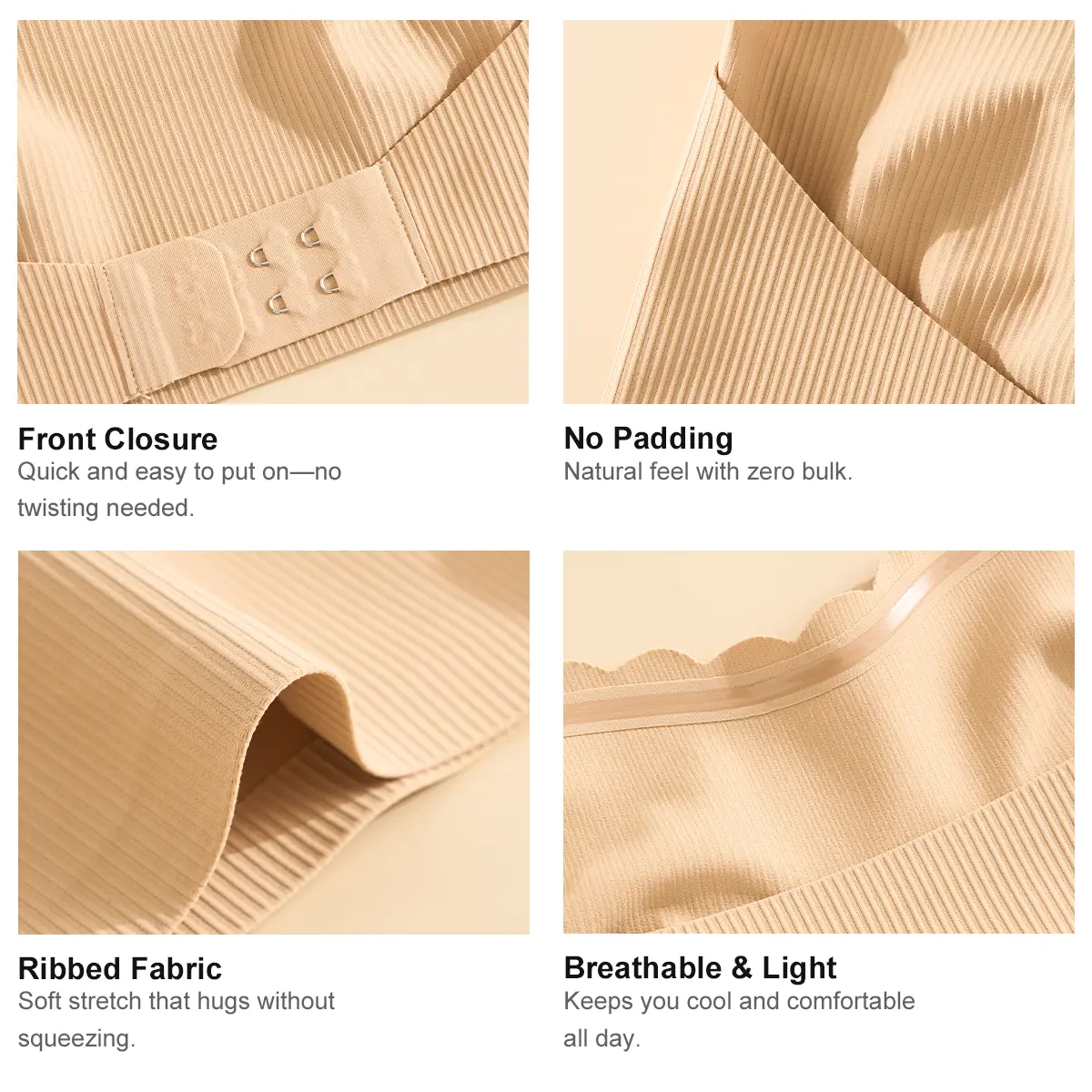Front Clasp Design – Easy on, easy off—no twisting or stretching