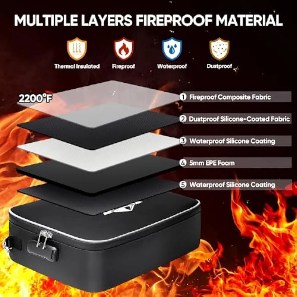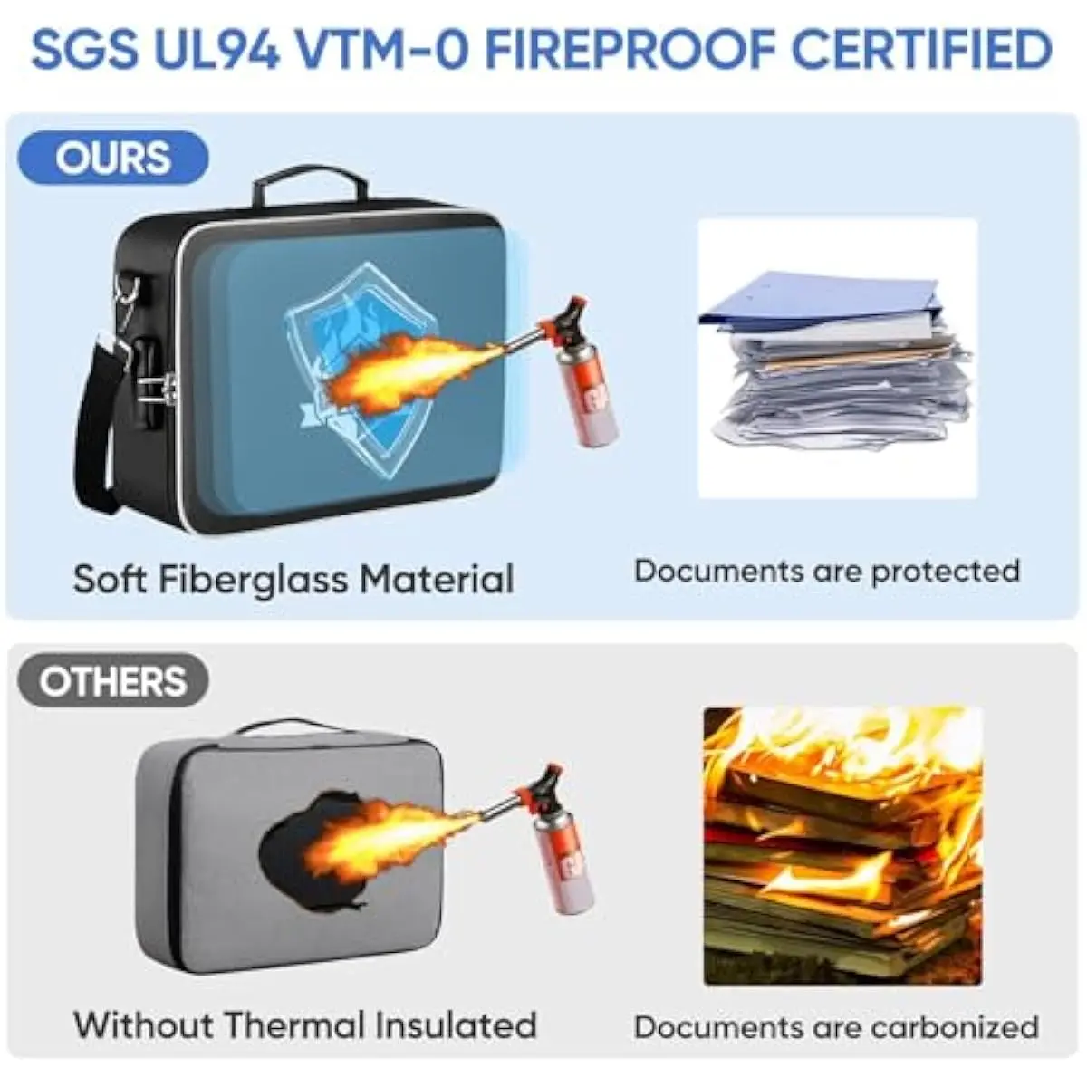 Fireproof and Waterproof: The fireproof document bag is made of dust-proof silicone fiberglass, offering fire resistance up to 2192℉, SGS-certified (UL94 VTM-0); Its waterproof design protects your documents from rain and spills (No folders included)