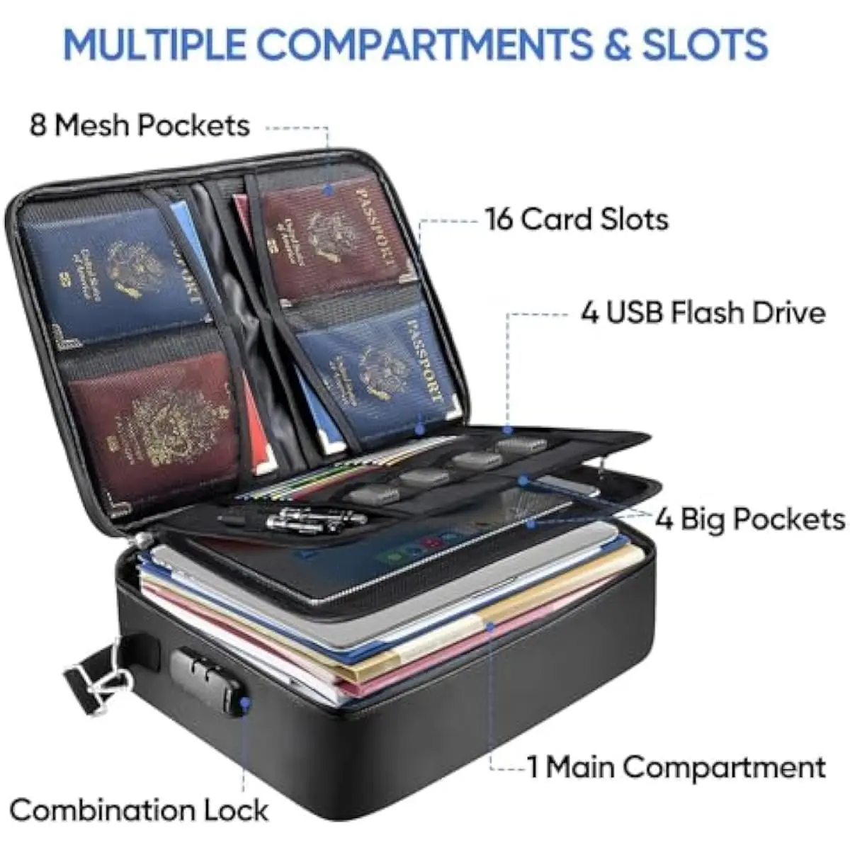 Large Capacity: The document bag (15''x11''x4'') features a three-layer design and includes 12 different sizes of mesh compartments, 16 card slots, 4 U Disk pockets, and one spacious main pocket. Elastic straps keep items neatly in place, keeping everything remains organized