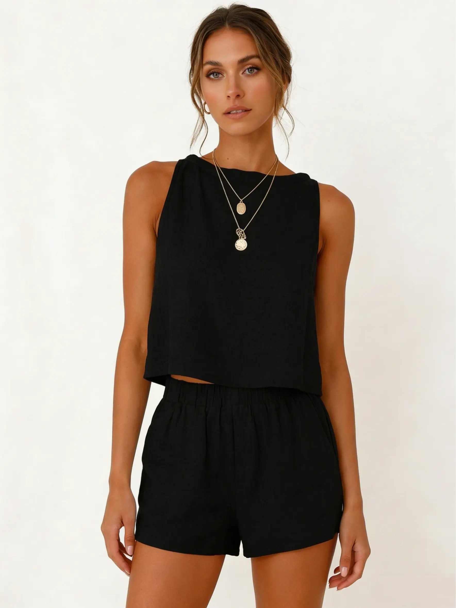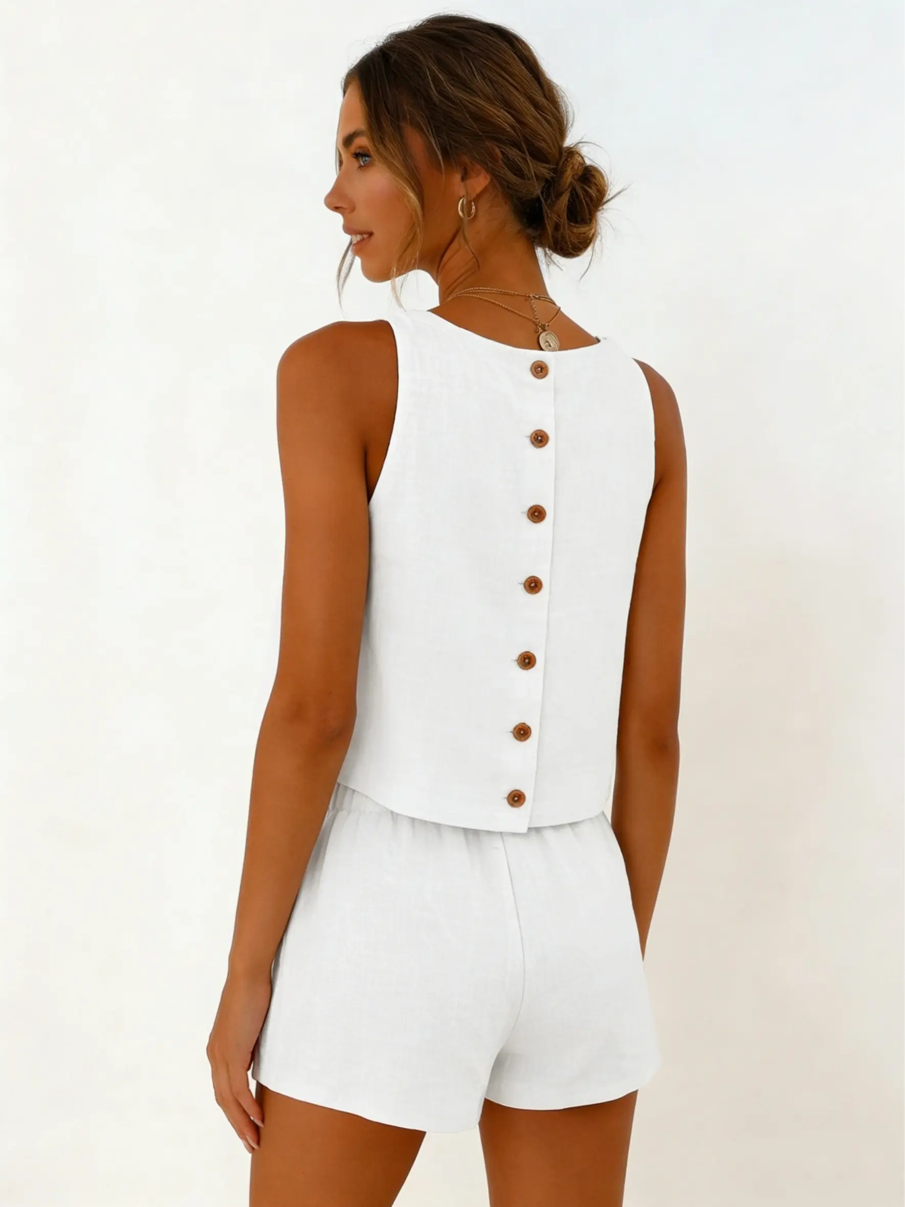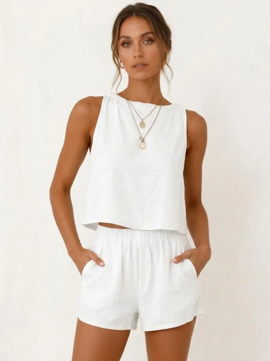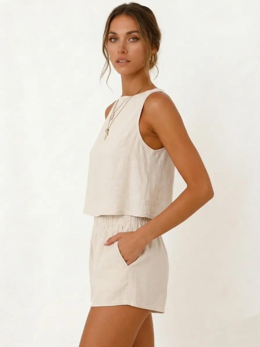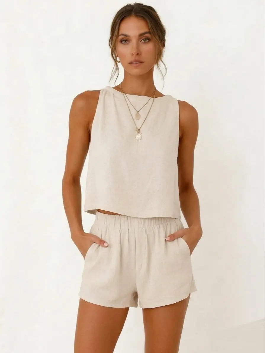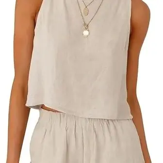 ·Features: Tops(Crewneck, sleeveless, cropped length, button decorative on the back, linen tank tops for women), Shorts(Full elastic waistband, side pockets, above the knee length, linen shorts for women)
