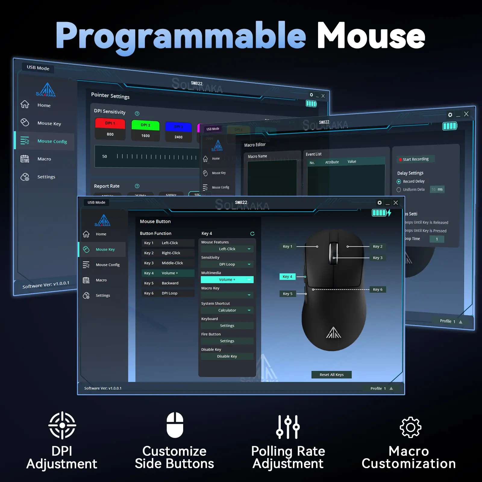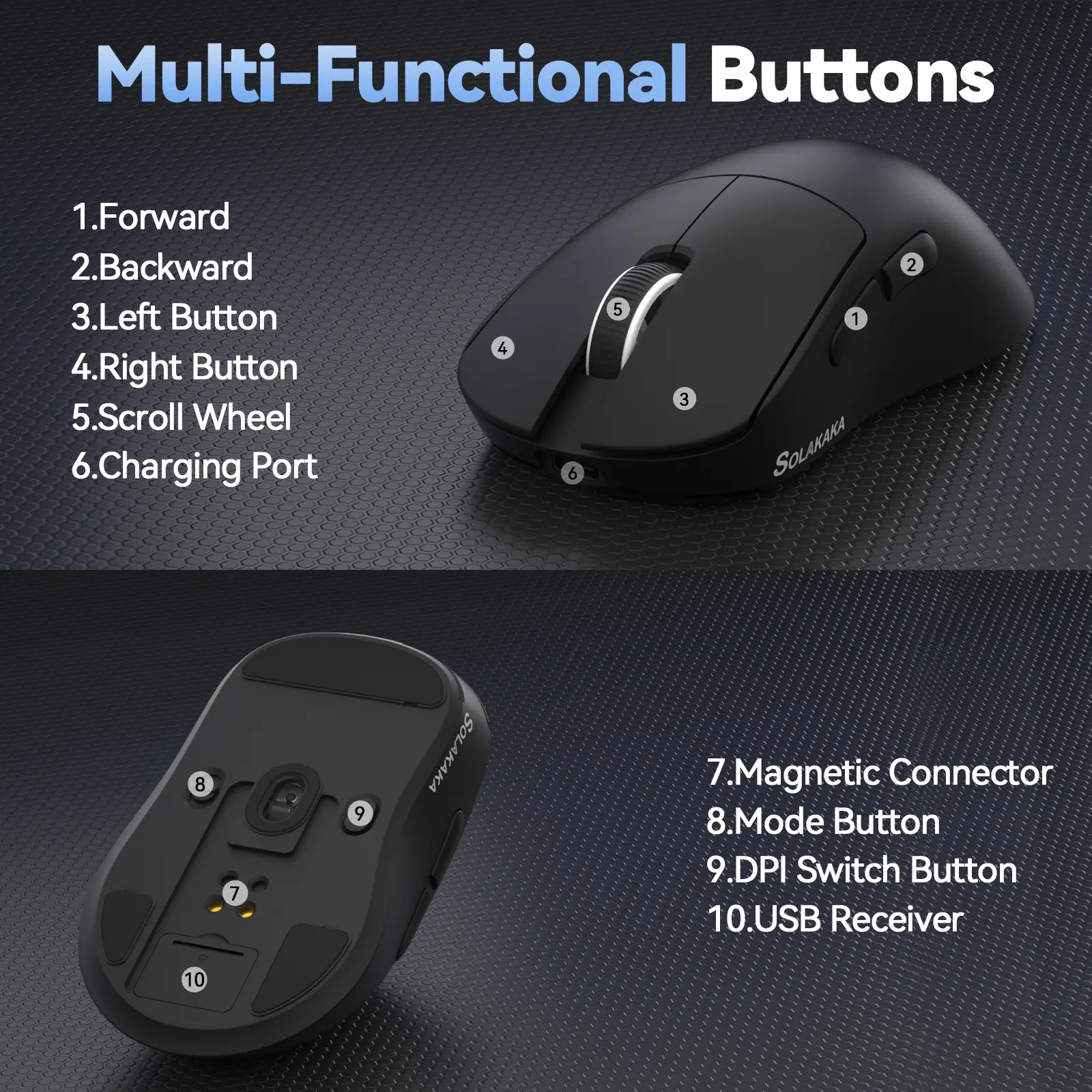 ·Programmable Button: This computer mouse has 5 programmable buttons. It features “forward” and “backward” buttons on the side allow for easy web browsing and quick, stable shooting in games. And you can customize the side buttons, adjust DPI, adjust the polling rate, and record macros via the driver. Software download: solakakadriver.com (Note: This software only supports Windows systems. Please run the driver in wired mode.)