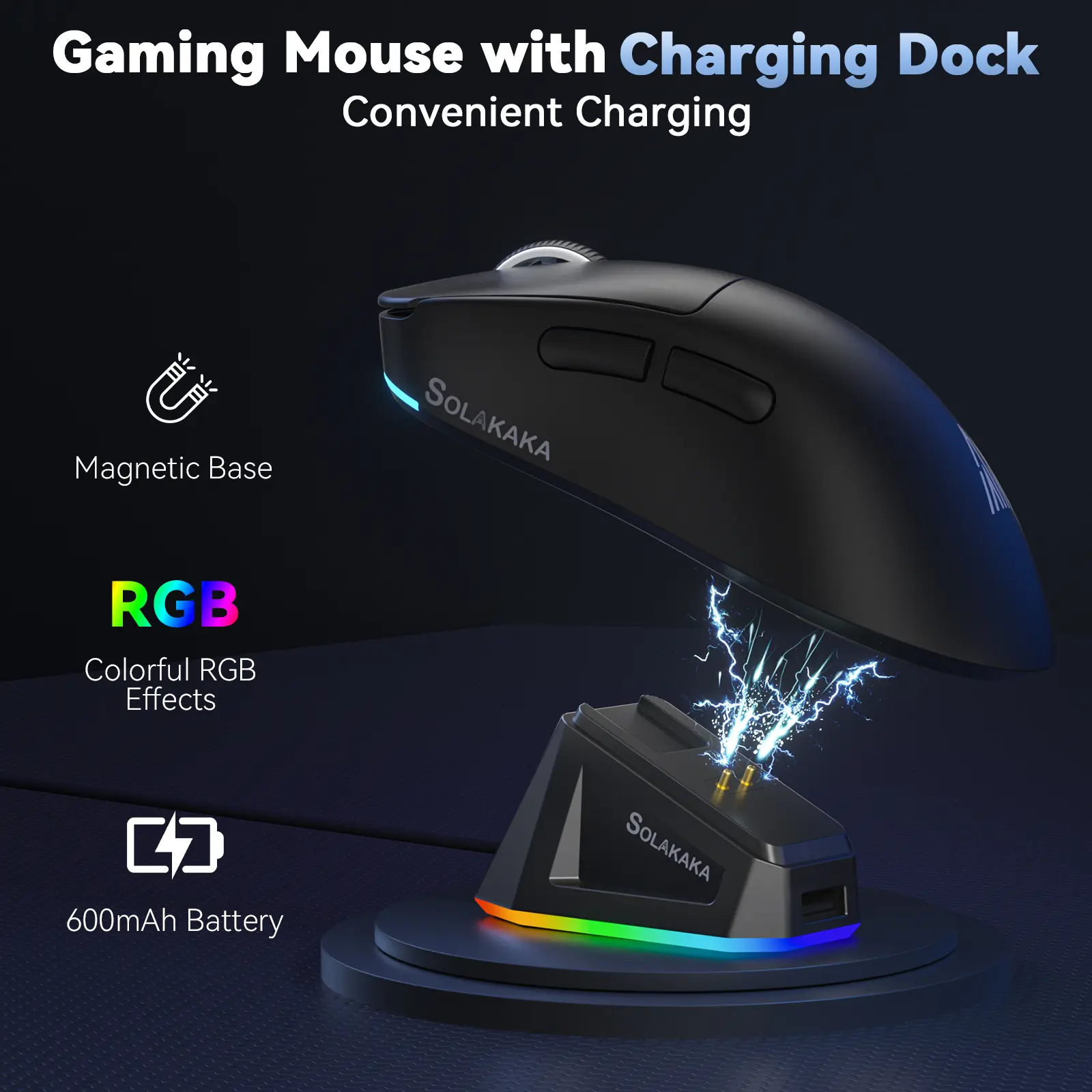 ·Magnetic Rechargeable Base: This rechargeable mouse features a magnetic charging dock with RGB backlight, designed for effortless placement and to power up the mouse in an innovative way. When the base connected to your computer, the mouse's USB receiver can be inserted into the base, and the pc gaming mouse can be switched to 2.4GHz wireless mode to connect to the computer. This eliminates the need for frequent USB plugging and unplugging, ensuring a smoother wireless connection.