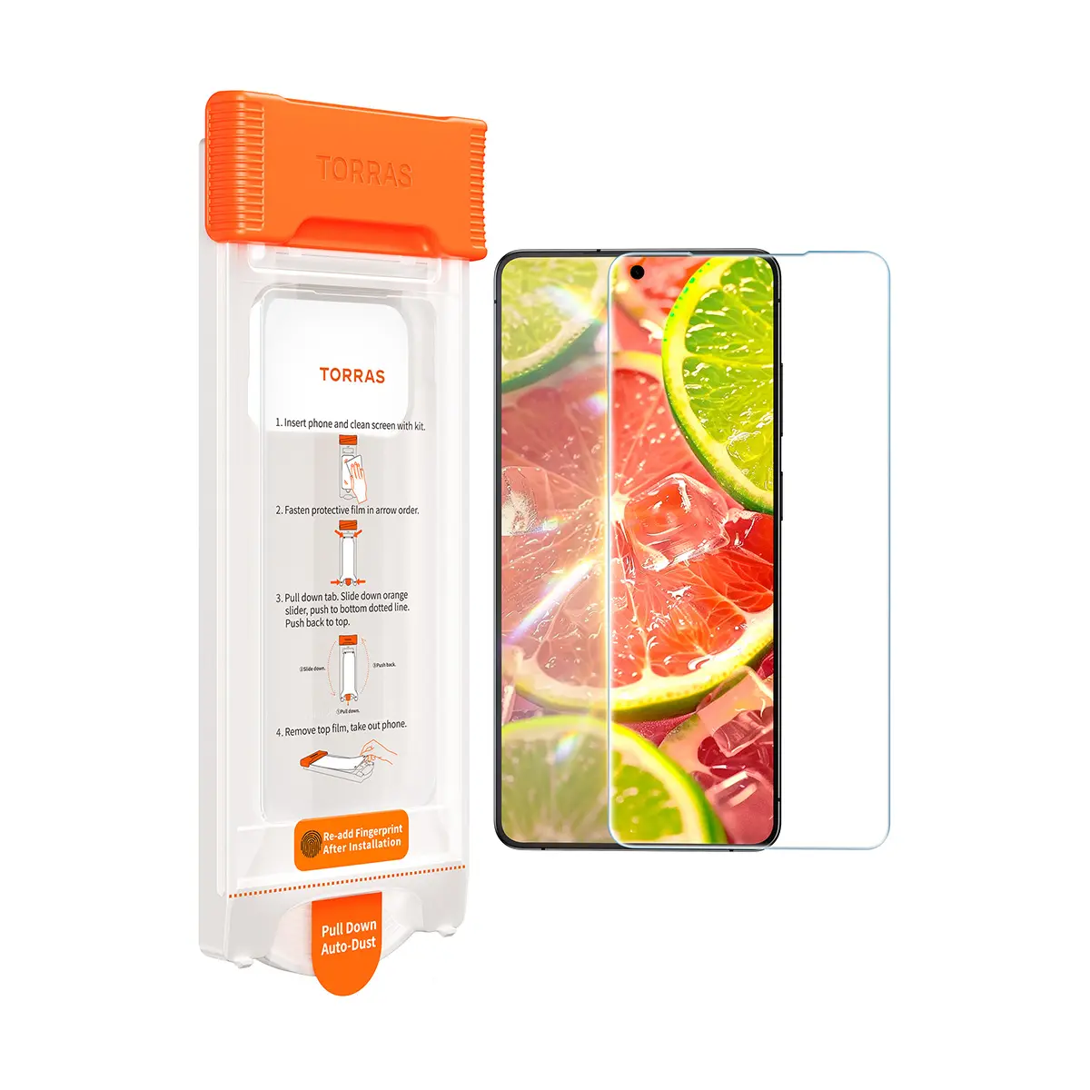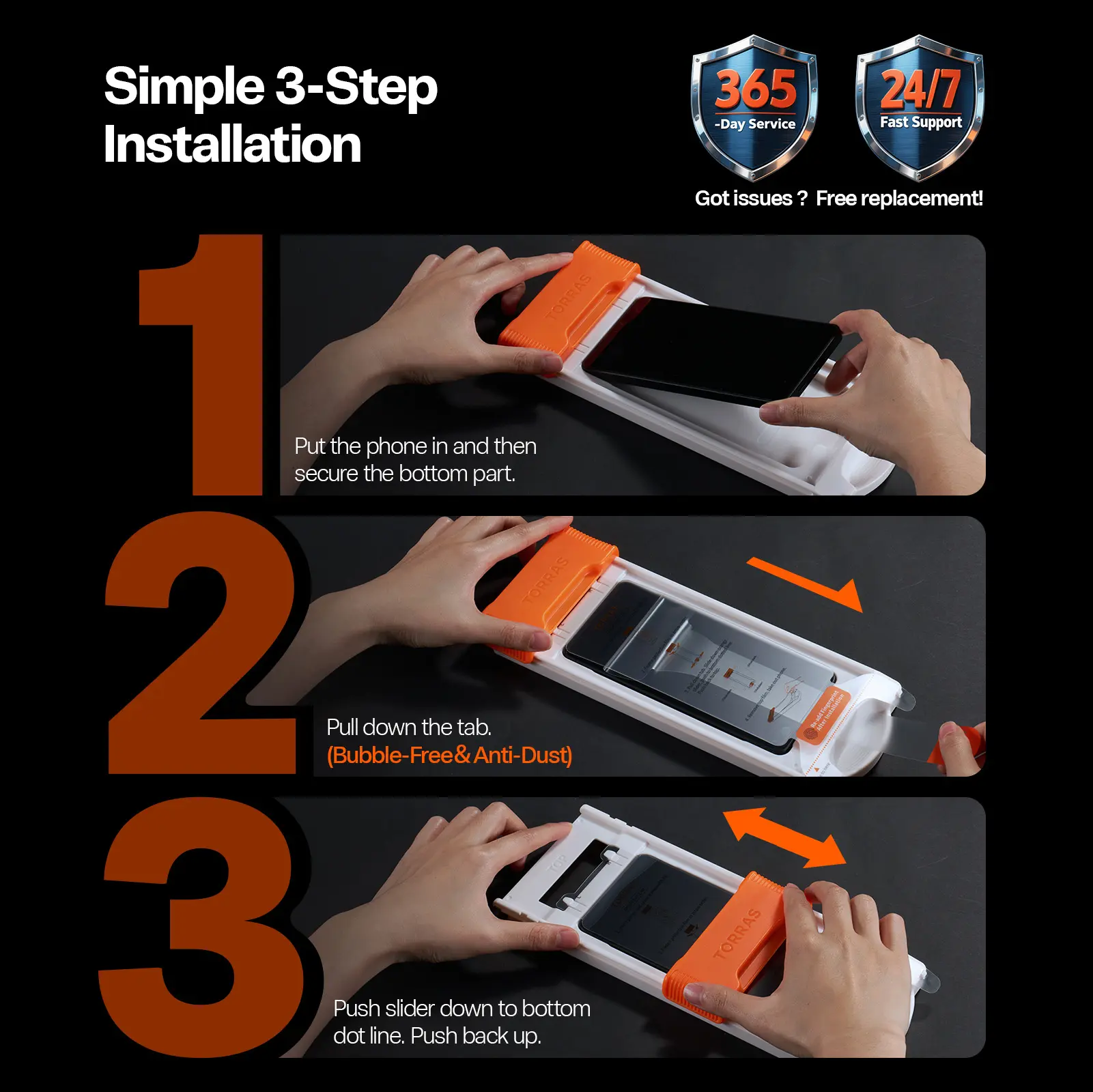 ·[Simple 3-Step Installation, Bubble-Free & Anti-Dust] TORRAS’s innovative installation kit makes application effortless. Just "One Cover, One Pull, One Slide" – and you’ll apply the screen protector perfectly. No more worries about bubbles, misalignment, or dust. It’s the ideal choice for perfectionists. (If there are any bubbles, simply use the cleaning cloth to push them outwards to the edge.)