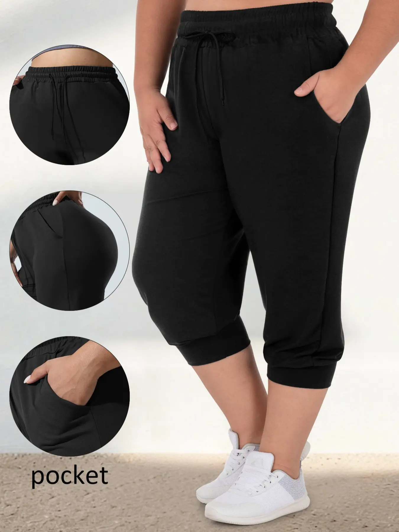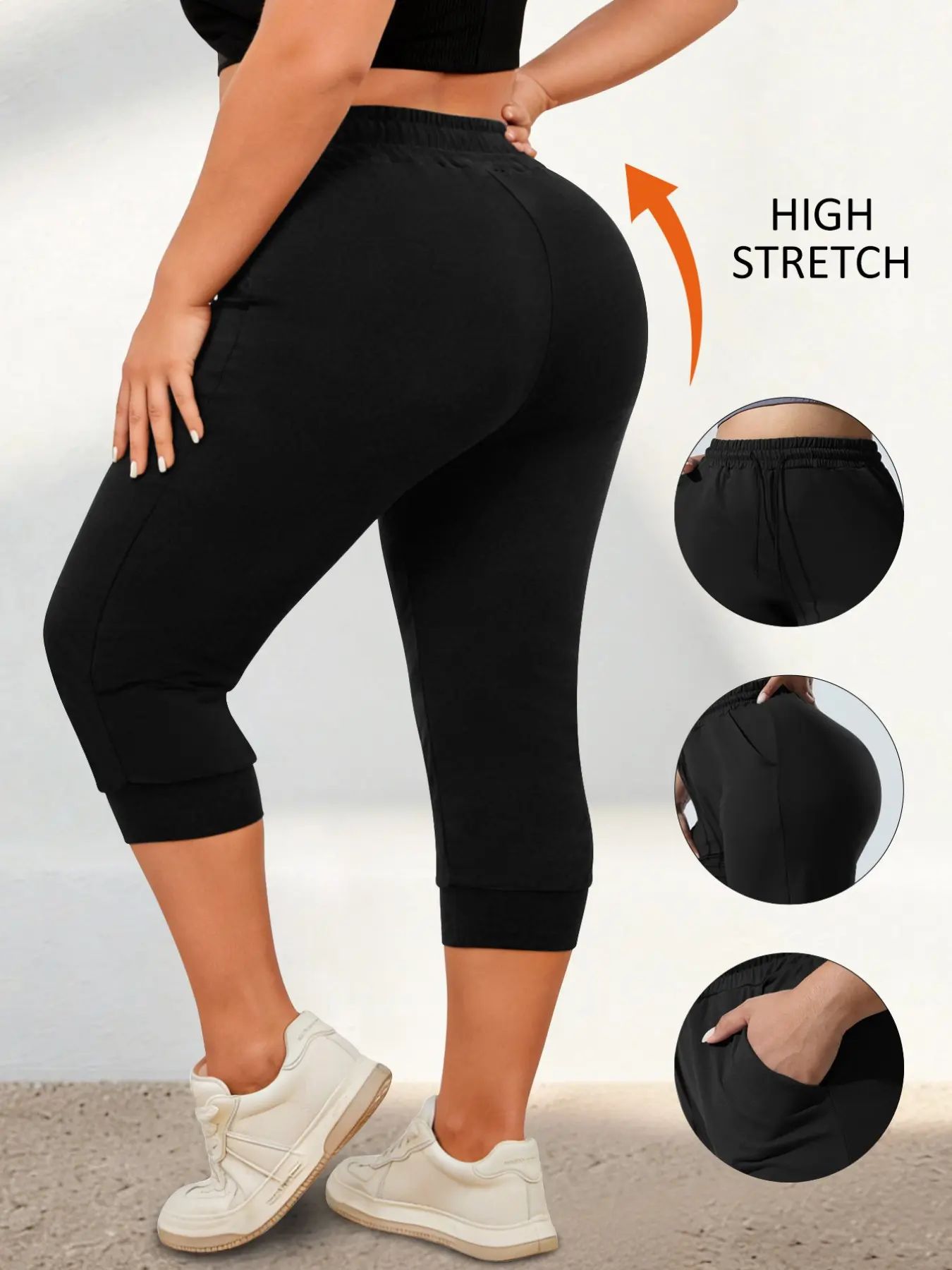 Women's Plus Size Capri Sport Pants with Pockets, High Elasticity, Adjustable Drawstring, Soft Casual Fit, Comfortable and Stylish