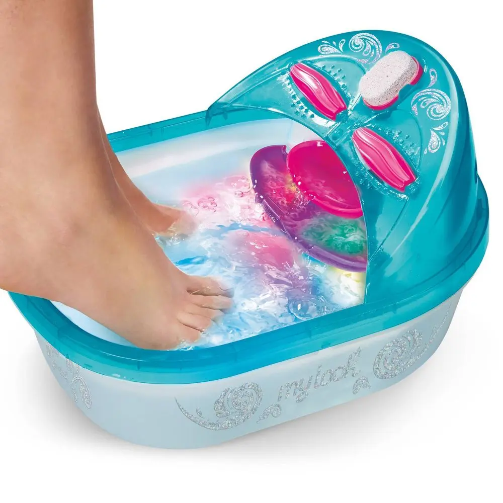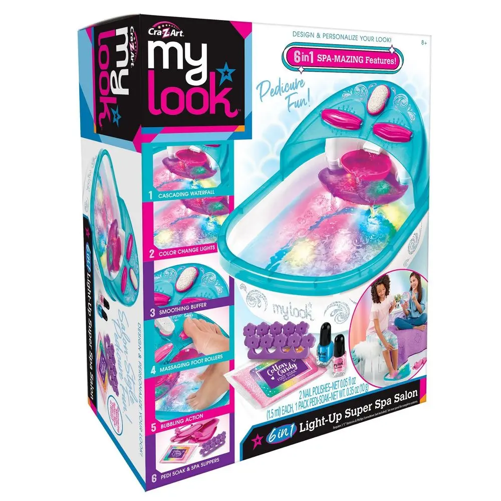 Get a salon style pedicure at home with the MY LOOK 6-in-1 Light-Up Super Spa Salon Activity Kit! Features all new color-changing light effects reflect onto the water! For a fun colorful light show! Includes massaging foot rollers and foot buffer, real polishes, pedi soak, pedi slippers & more! Intended for ages 8 and up.
