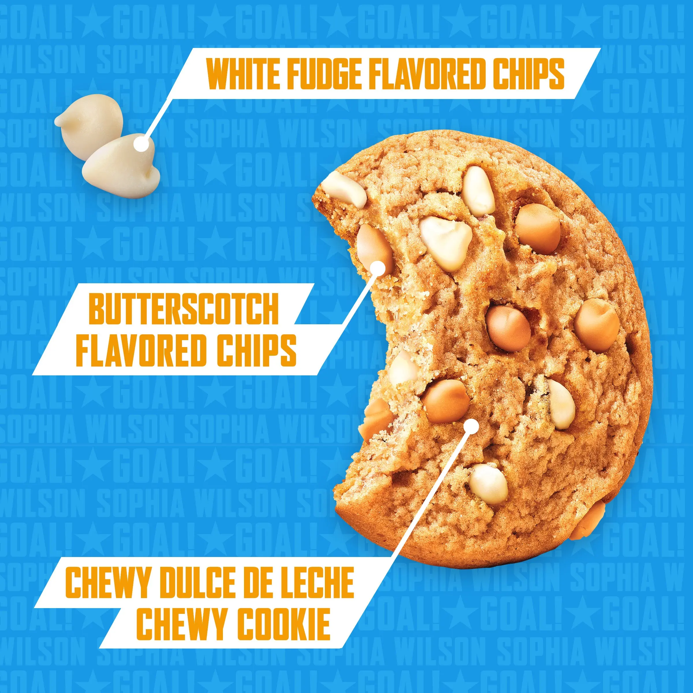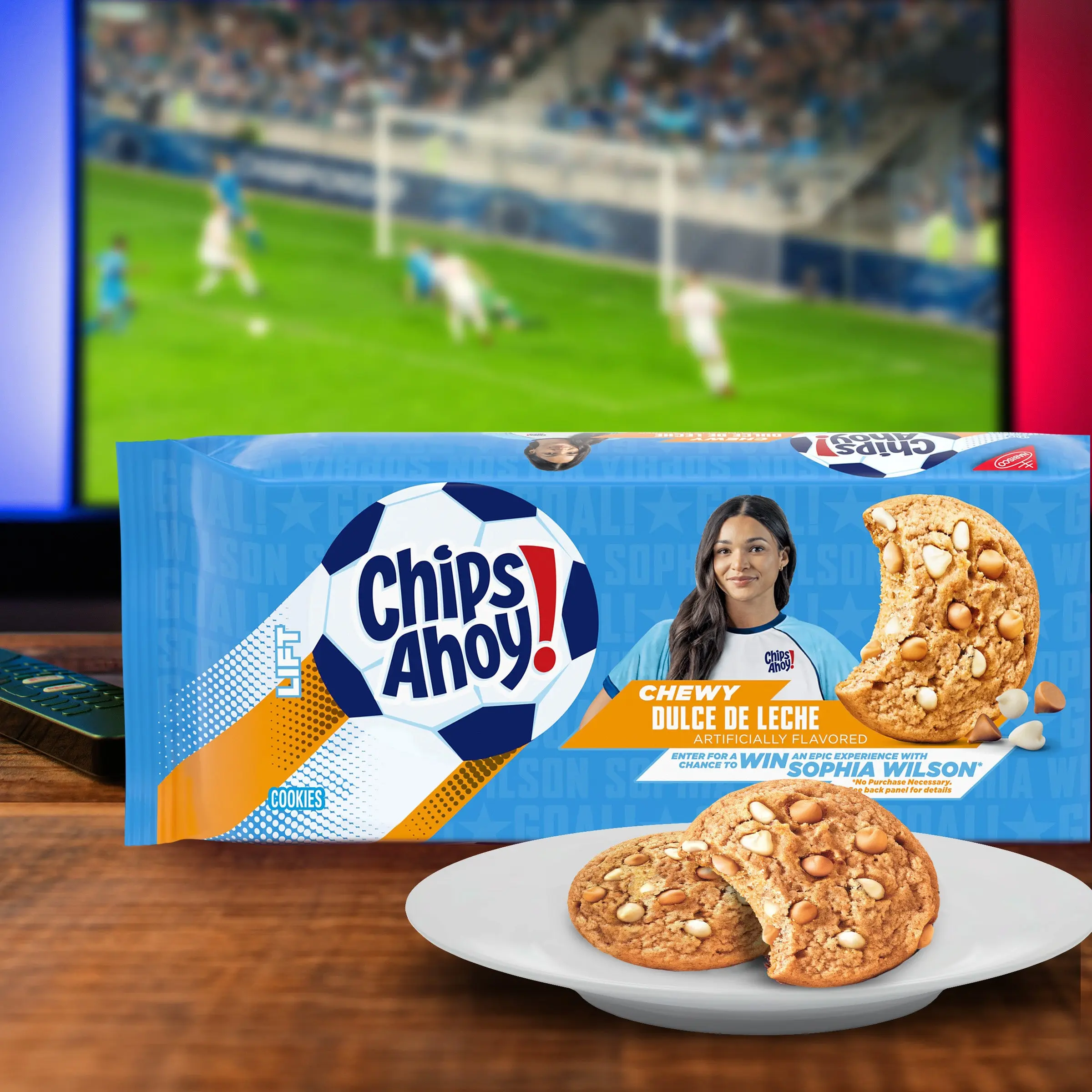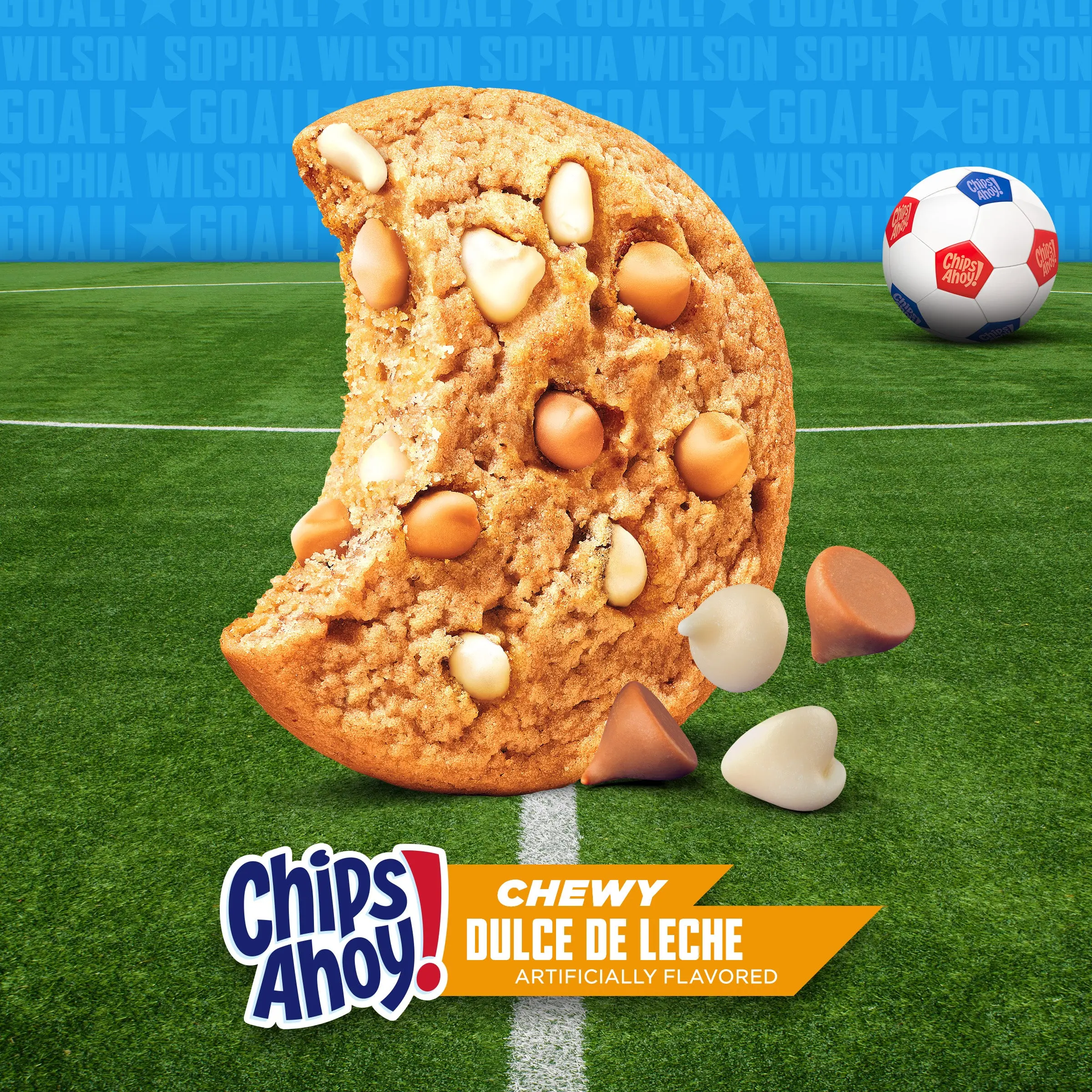 A scrumptious score for soccer fans and dulce de leche lovers, CHIPS AHOY! Chewy Dulce de Leche-Flavored Cookies are inspired by the popular Latin American caramelized dessert. The dulce de leche-flavored cookies are baked for maximum chewiness and feature white fudge- and butterscotch-flavored chips. Make game day snacks more exciting with limited edition sweet treats in packaging with a soccer-inspired design featuring professional soccer player Sophia Wilson. The kosher snack cookies are fantastic office snacks and travel snacks.