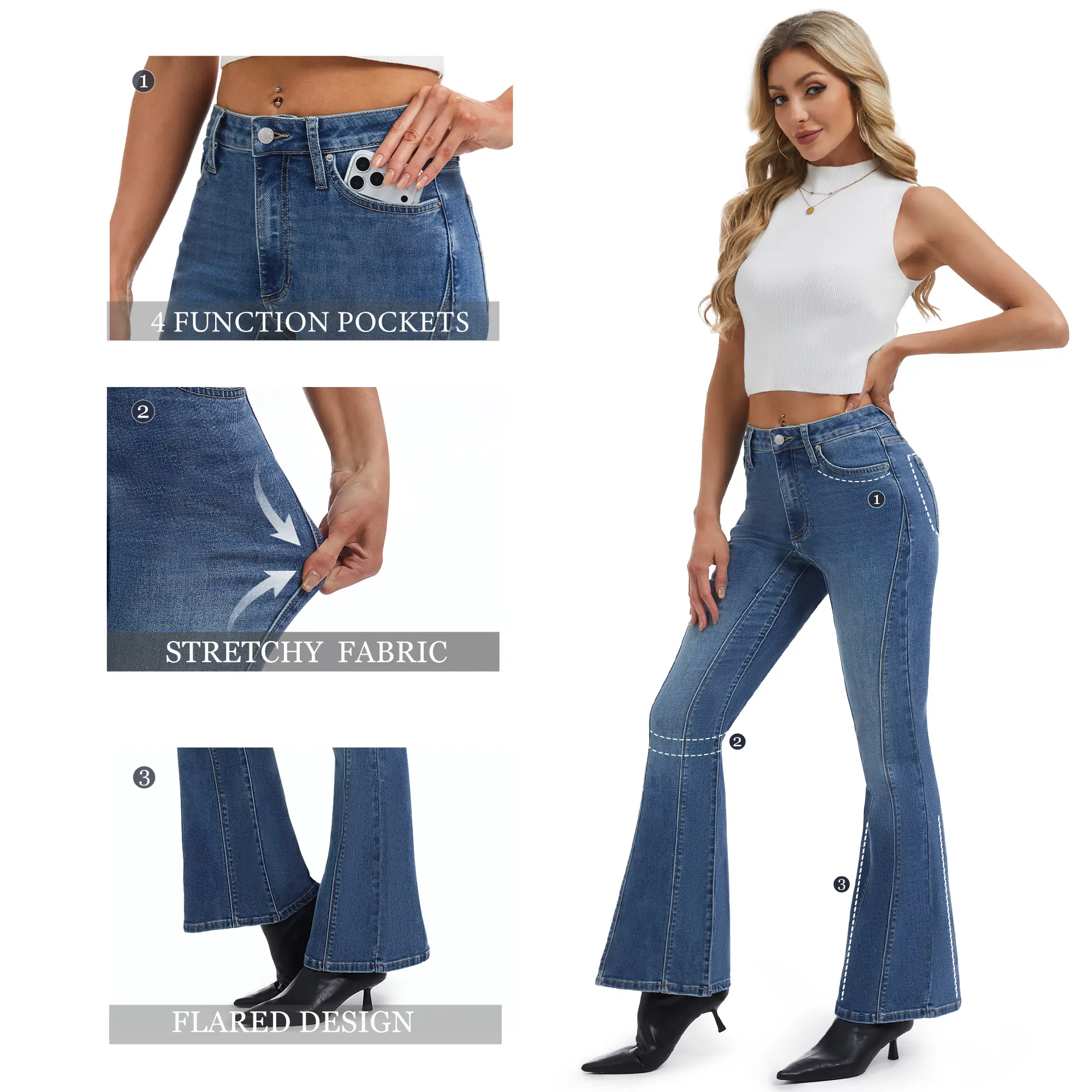 YUCOLEN jeans are stylish, versatile, and comfortable. The flared, stretchy design pairs well with any top, while heels or flats complement the look perfectly. The classic four-pocket design provides convenient storage for everyday essentials, adding both functionality and practicality to your outfit.