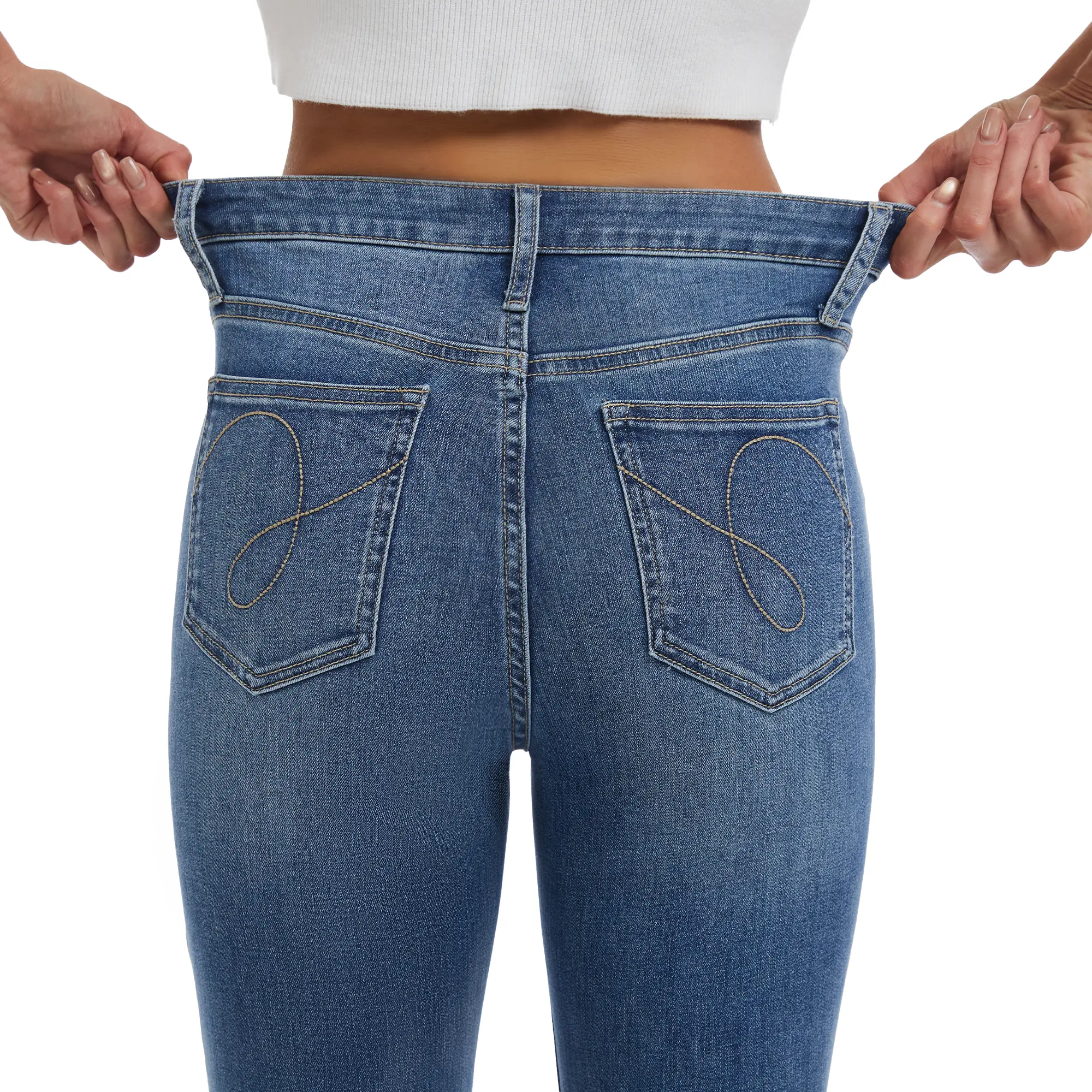 Fashionable decorative stitching tapers above the knees, enhancing structure and dimension. Two vertical seams run along the legs, visually lengthening them for a sleek, straight appearance. Embroidered back pockets with classic seagull stitching lift and shape the hips, accentuating a full, flattering silhouette.