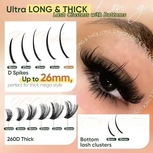 Versatile Lengths Eyelash Clusters: With lengths ranging from 8mm to 10mm long bottom lashes, 18mm-26mm long spike lash clusters, and 14mm-24mm 260D volume lsh clusters, this set caters to all preferences from subtle enhancement to bold, dramatic volume that makes your eyes appear larger and more captivating