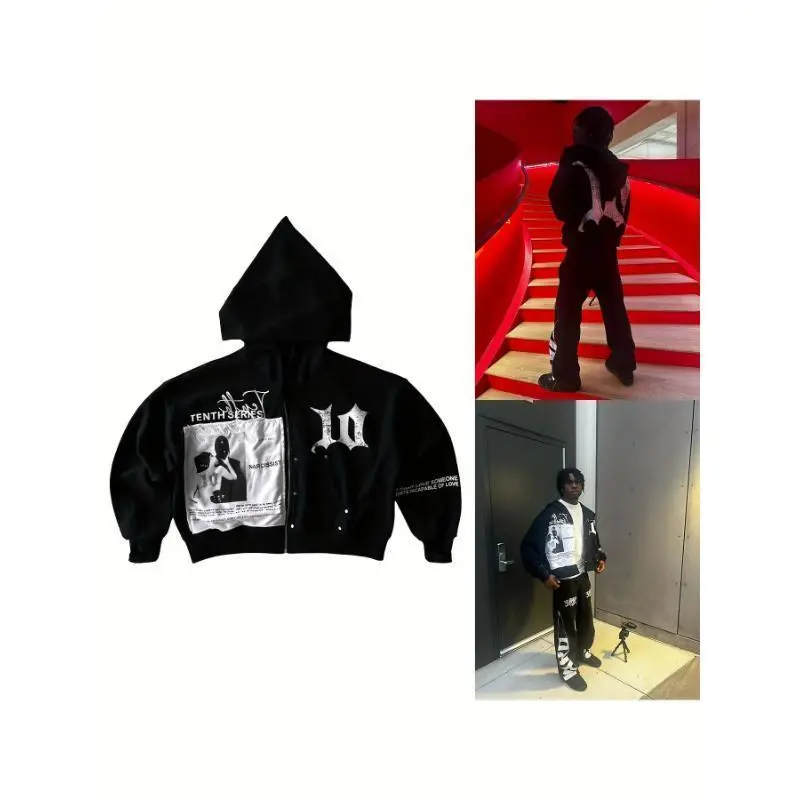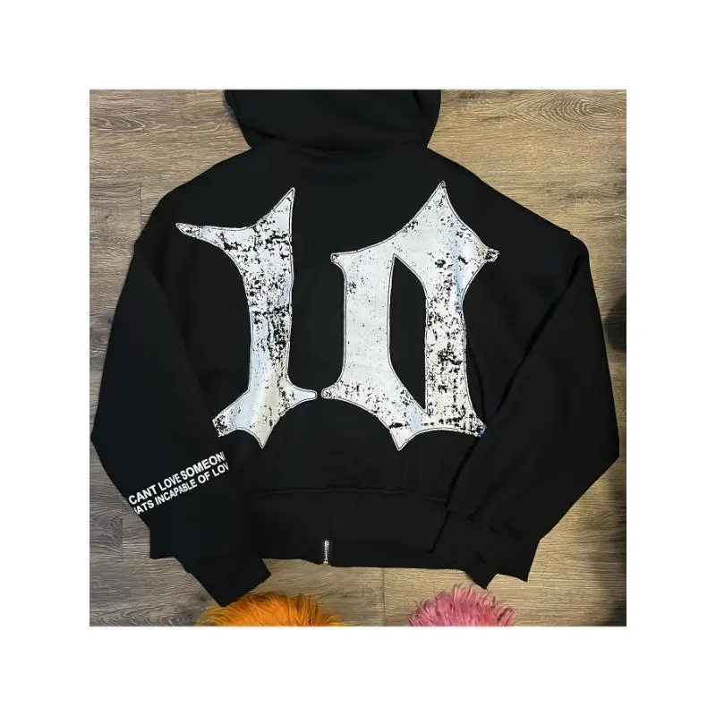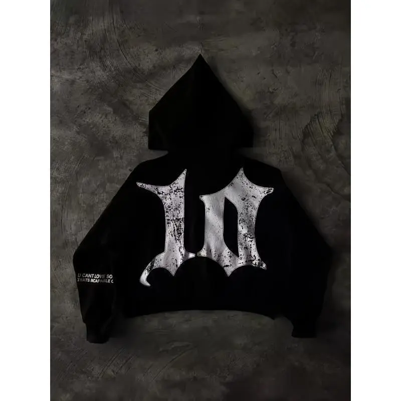5. Unisex Oversized Zip-Up Hoodie with Graphic Patchwork Design & Glove Detail - Y2K Harajuku Streetwear Sweatshirt, Black Casual Pullover for Fall Winter Layered Look, Autumn Streetwear, Comfortable Wear Menswear Sleeve Fabric Polyester Stretch Tops
