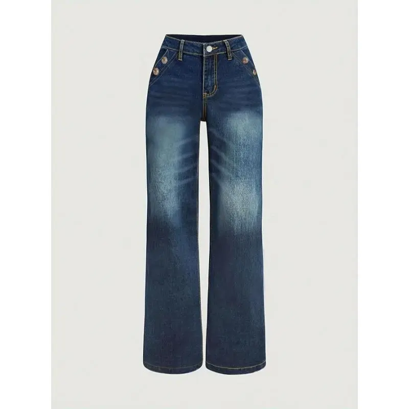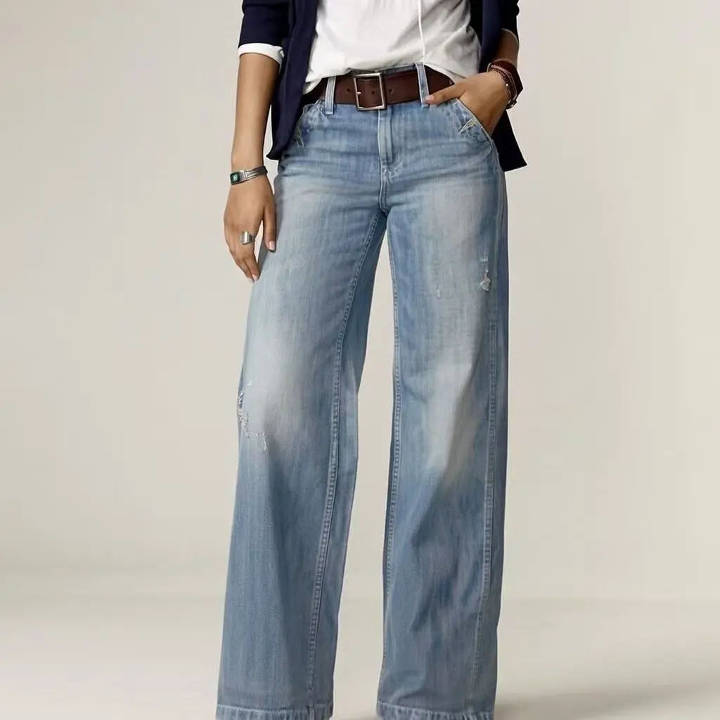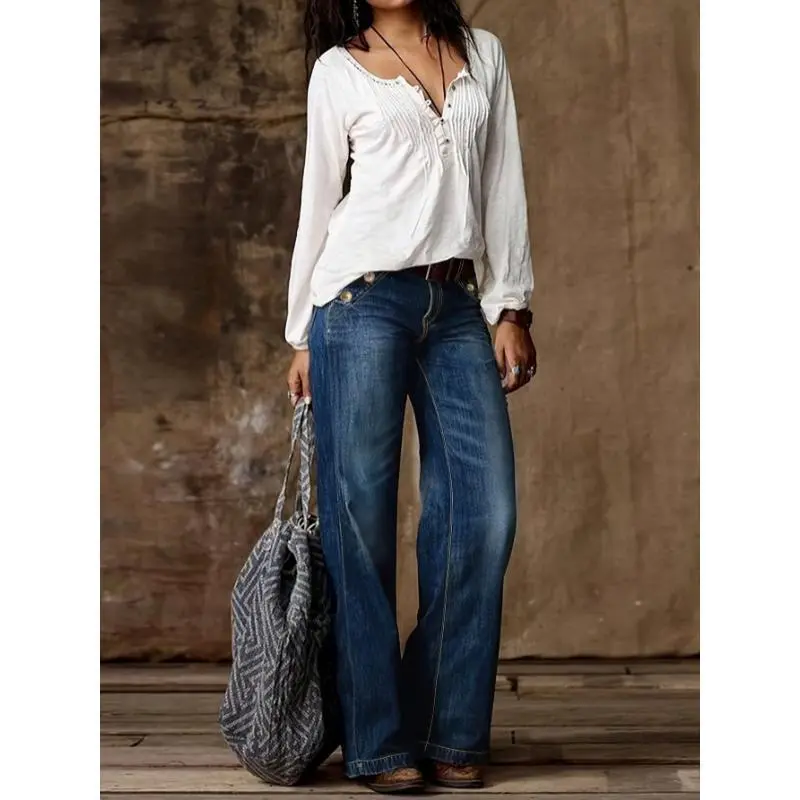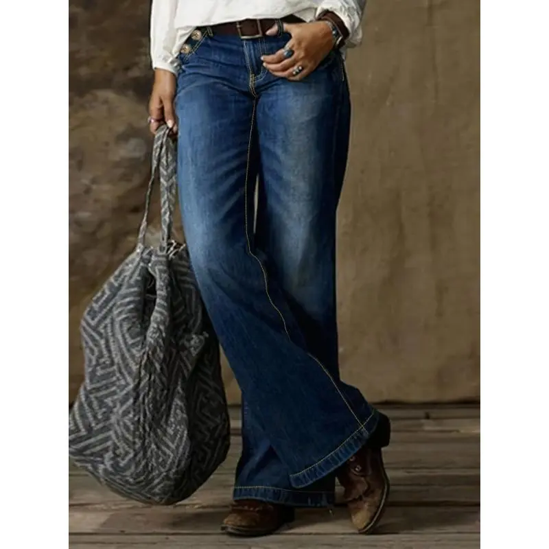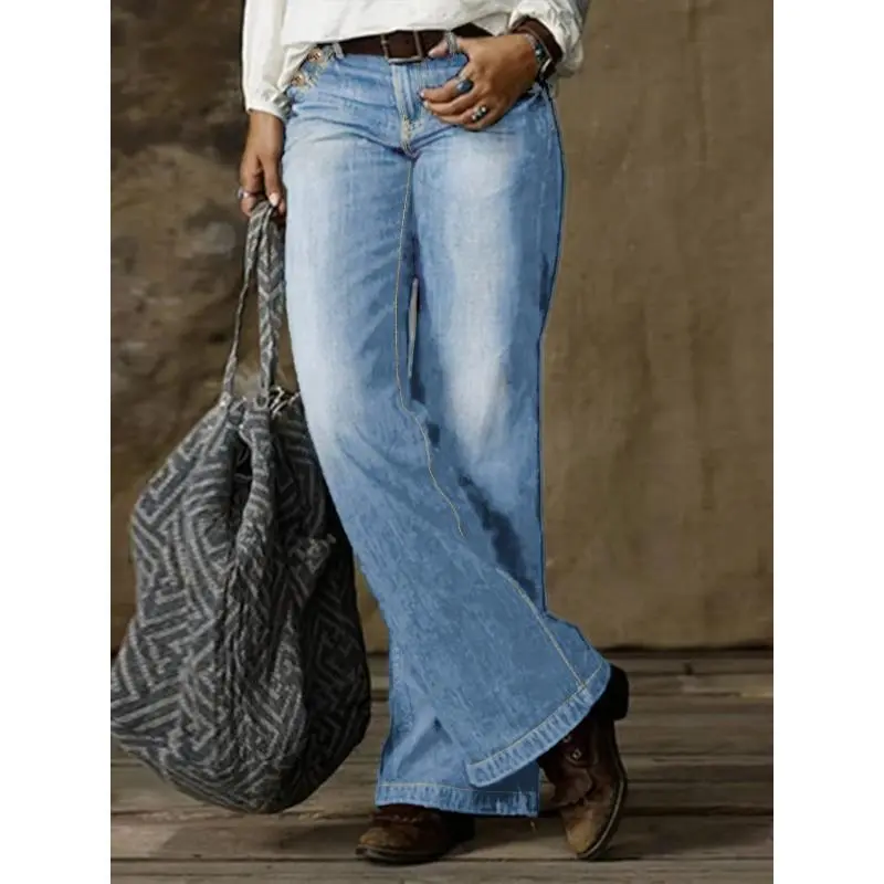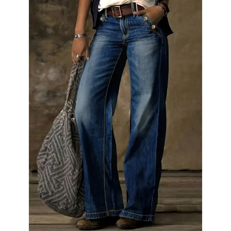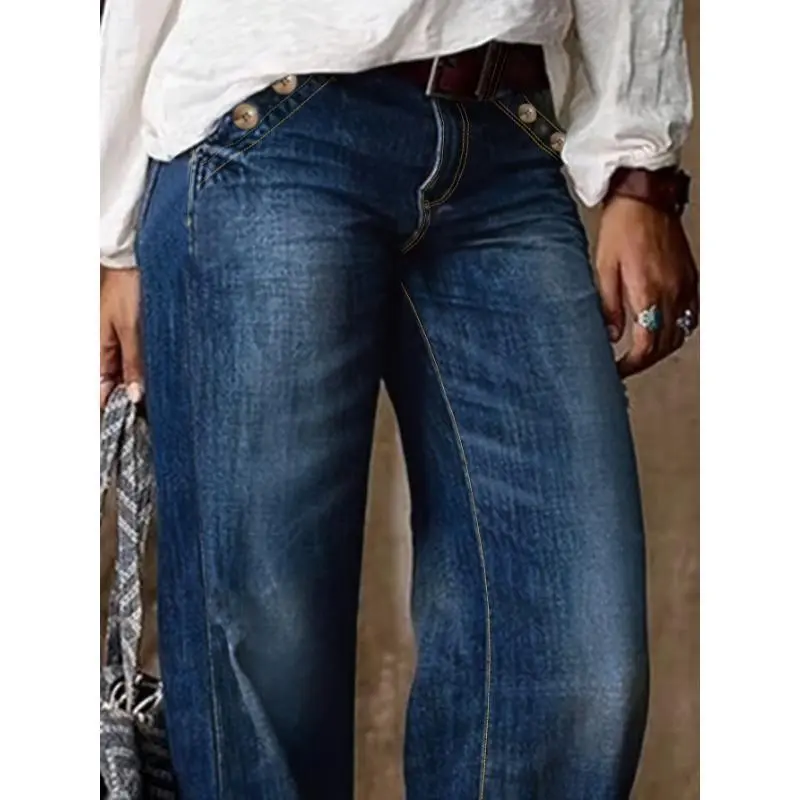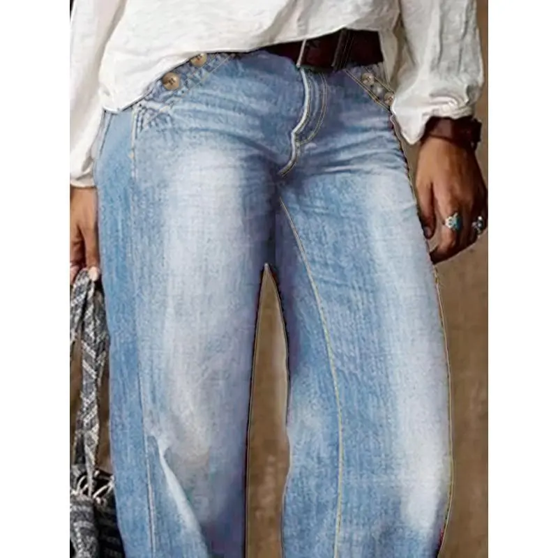 5. Loose Fit Washed Blue Casual Style Zipper Button Closure Denim Pants, Women's Denim Jeans & Clothing