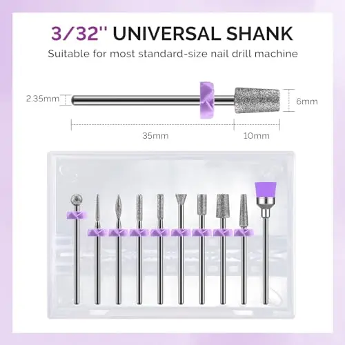 3/32'' Universal Shank Size: Suitable with most electric nail drills or rechargeable nail file machines. The nail drill bits set and small sanding bands are equipped with cute and dust-proof compact boxes. Ensure that will be able to carry them wherever you go. It is also easy to see through the cover and figure out the desired bits. Also suitable as a gift for nail lovers/ nail techs, such as friends, sisters, and mothers.
