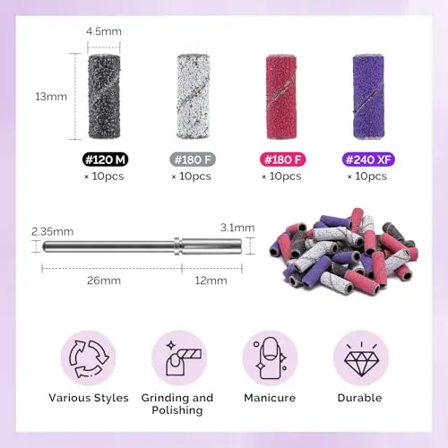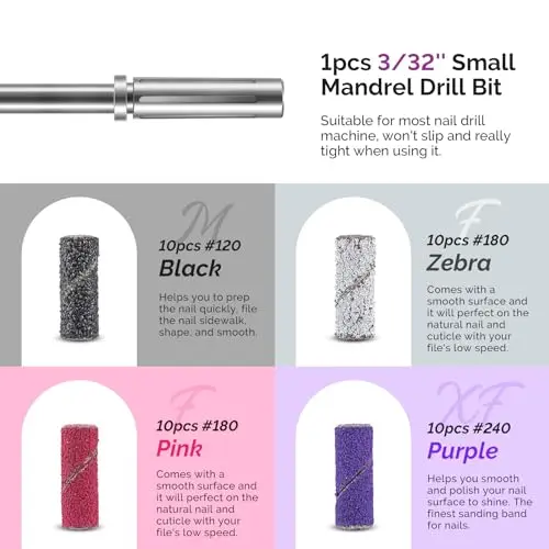 Superior 4 Colors Small Nail Sanding Band Set: You will receive 1 piece 3/32'' silver 3.1mm mandrel bit, and 40pcs of manicure sanding bands for nail drill, including #120 Black, #180 Zebra, #180 Pink, #240 Purple, 10Pcs each color for professional studio use or home use, saving your money.