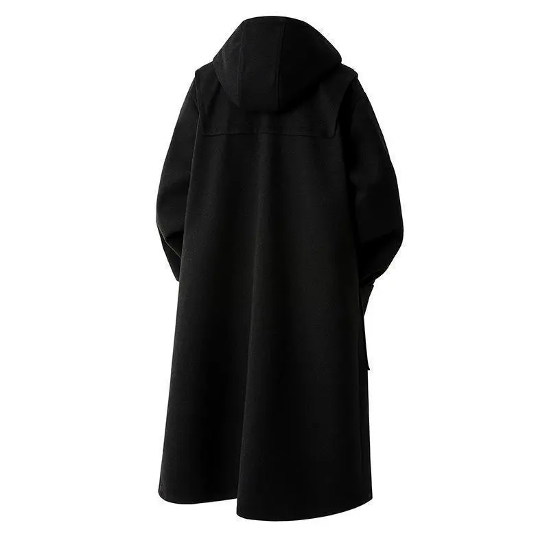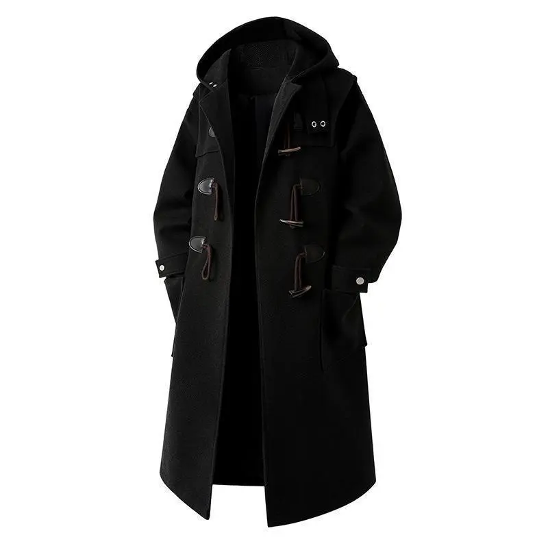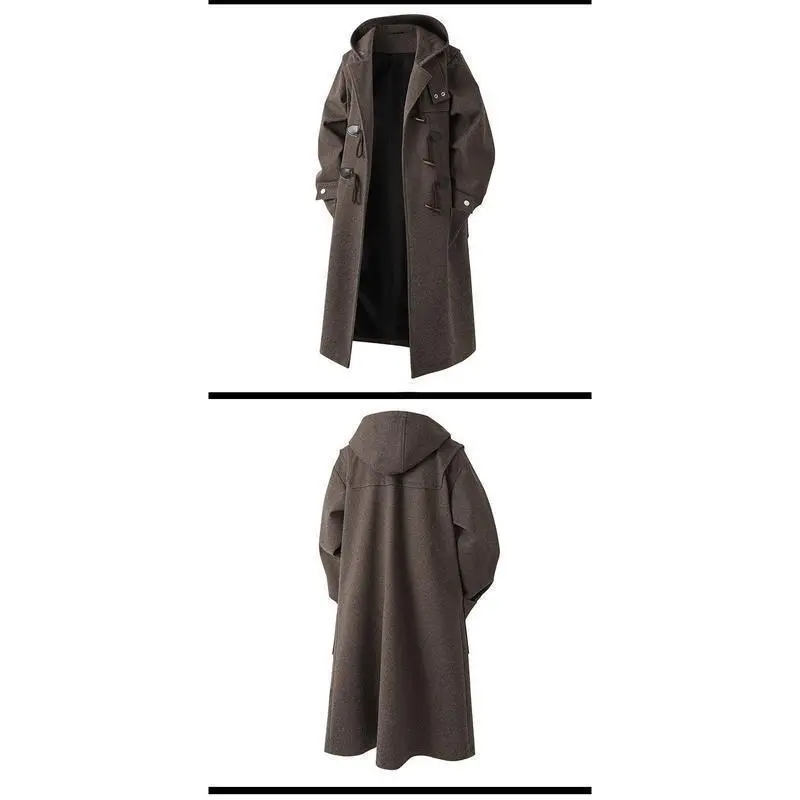 2025 Autumn Winter New Loose Plus Size Wool Coat Men's Mid-Length Trench Coat with Horn Buttons and Hood Menswear Jackets Casual Classic