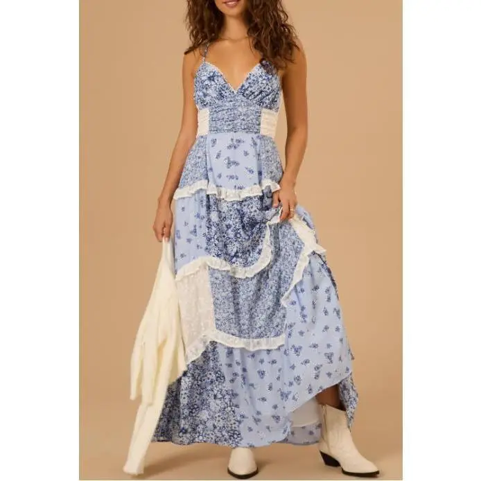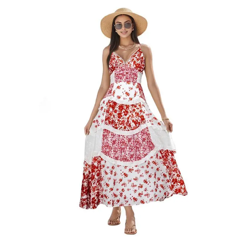 5. Women's Casual Summer Lace Patchwork Dress Puffy Short Halter Neck Smocked Tiered Ruffle Dresses