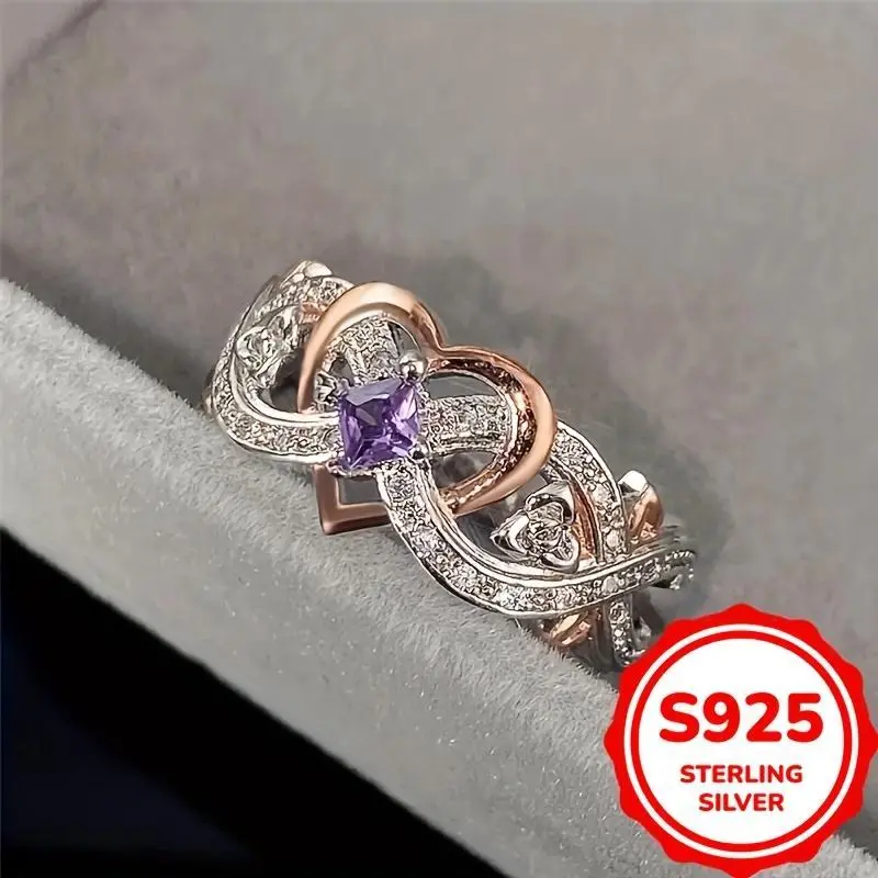 1pc Elegant 925 Sterling Silver Infinity Heart Ring with Purple Synthetic Zirconia, Engagement Wedding Band, Daily & Special Occasion Jewelry, All Seasons Compatible